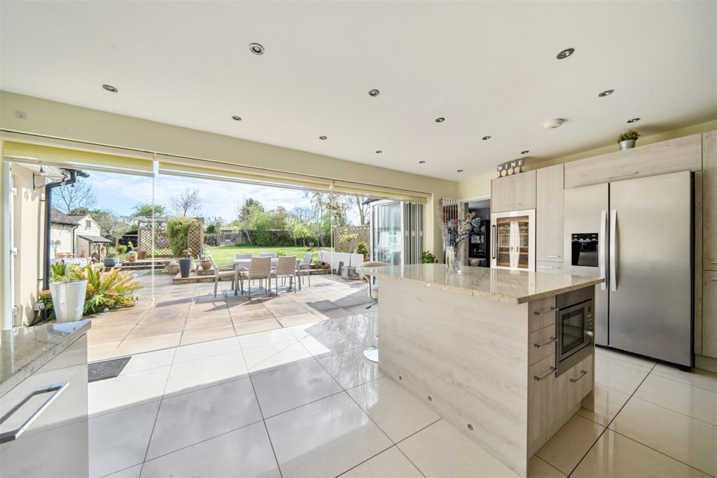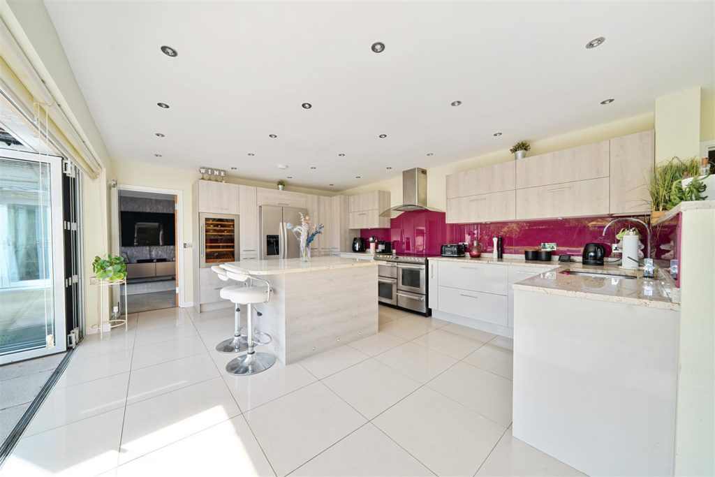 - Modern, open-plan kitchen/dining/family room with bi-folding doors to garden and door to utility room.