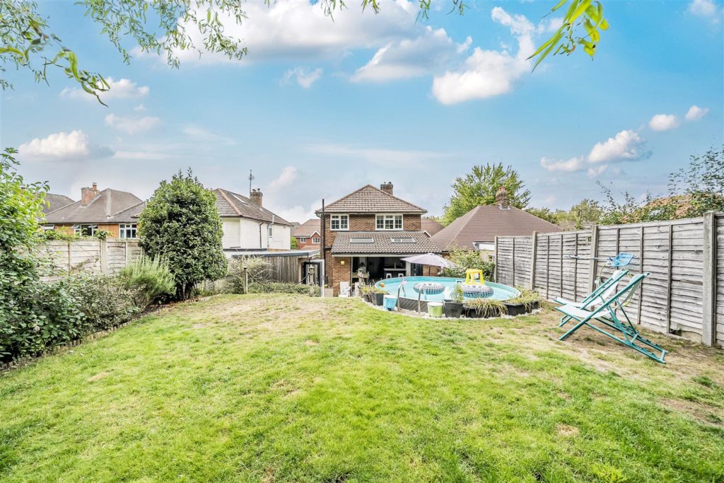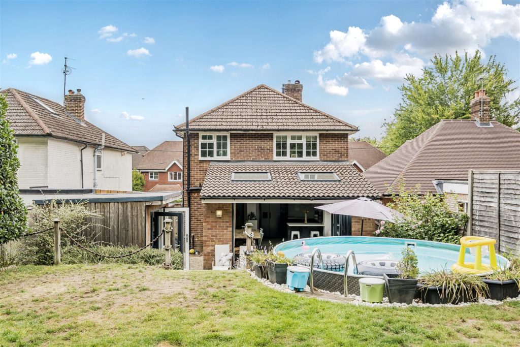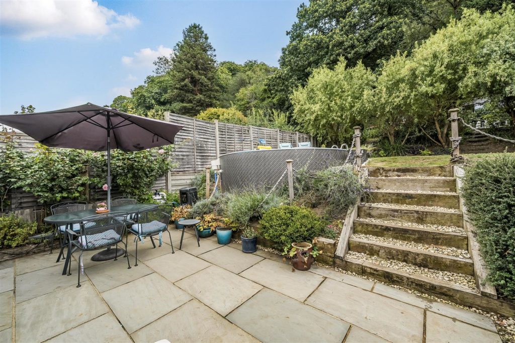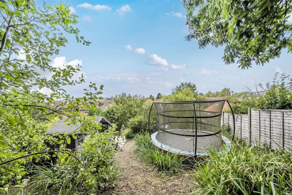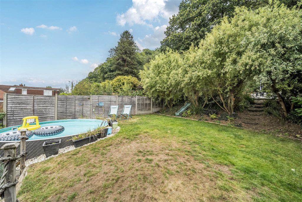 Outside, the south-facing garden is tiered and begins with a patio area accessed via the bifold doors, bordered with sleepers and offering access to a substantial garden office—ideal for home working or as a garden room. Steps lead to the next tier, which features a round swimming pool overlooking the patio and a lawned area with mature trees to the rear. Further steps ascend to an additional garden outbuilding and a seating area, with a gate providing direct access into Ladygarden Woods at the top of the garden.