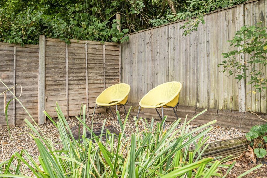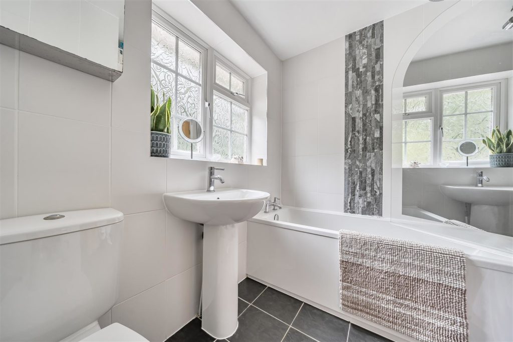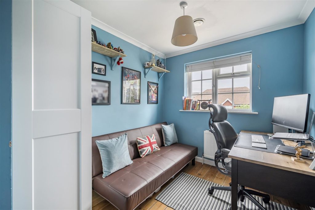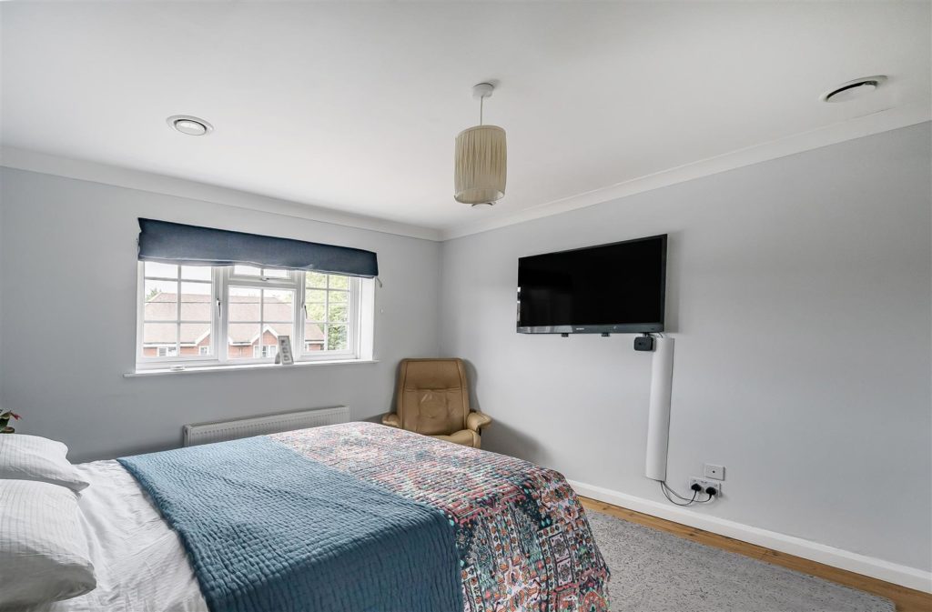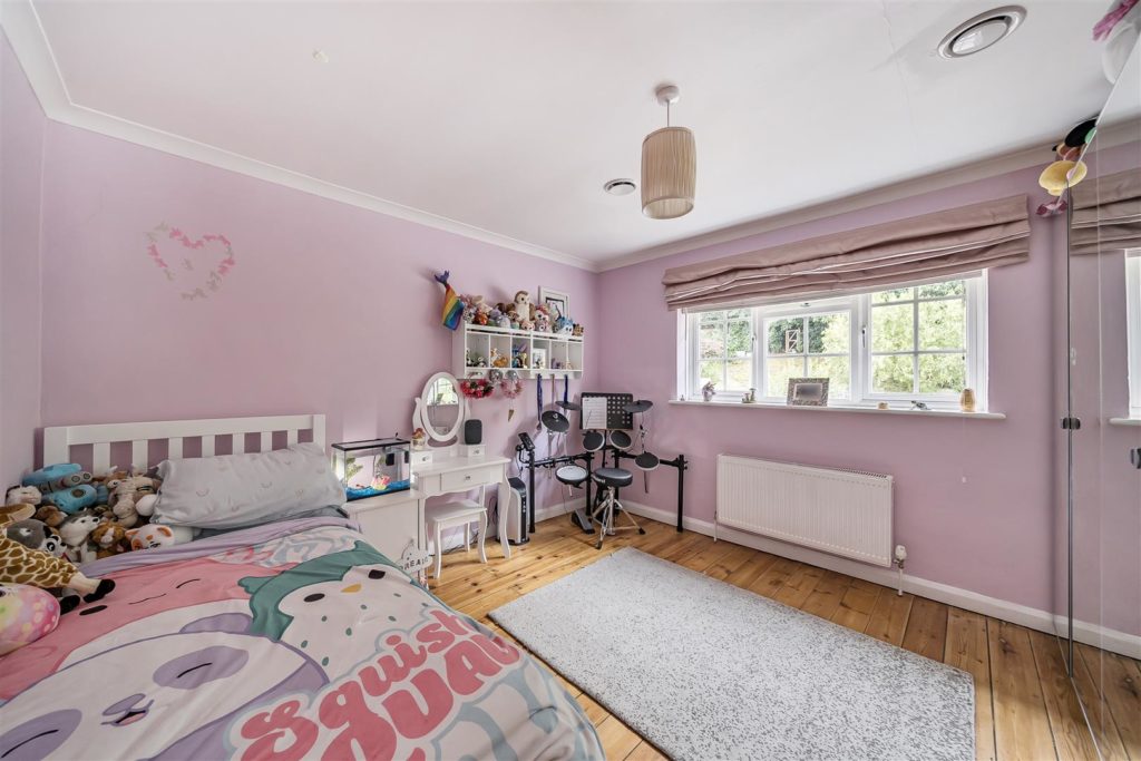 Outside, the south-facing garden is tiered and begins with a patio area accessed via the bifold doors, bordered with sleepers and offering access to a substantial garden office—ideal for home working or as a garden room. Steps lead to the next tier, which features a round swimming pool overlooking the patio and a lawned area with mature trees to the rear. Further steps ascend to an additional garden outbuilding and a seating area, with a gate providing direct access into Ladygarden Woods at the top of the garden.