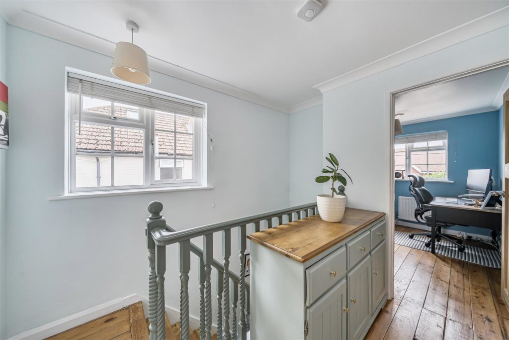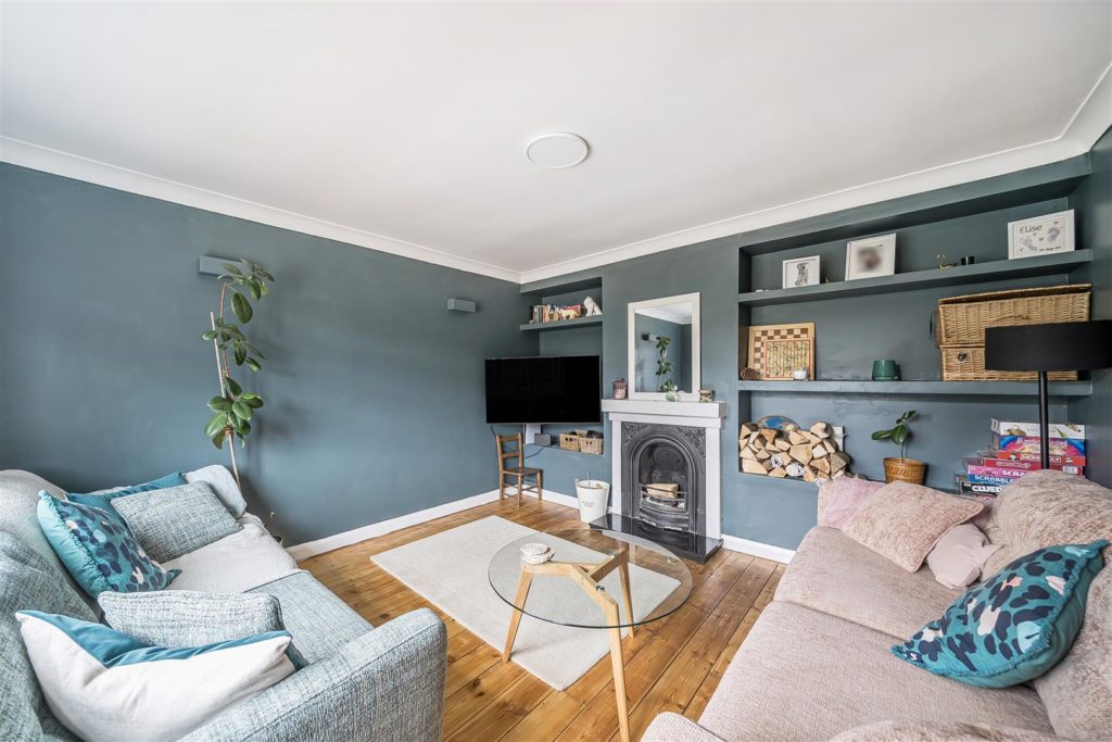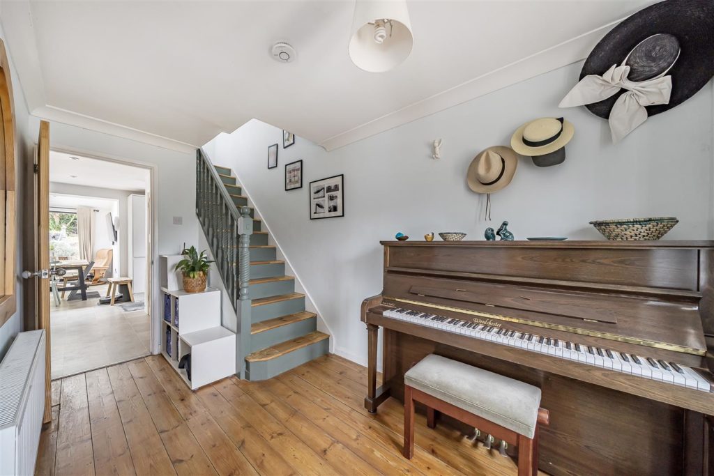 Water Beach is a beautifully presented home approached via a large gravel driveway with ample off-street parking behind twin five-bar gates. The property features attractive red brick elevations under a pitched roof and opens into a spacious hallway with stripped wooden floors and stairs ascending to the first floor. To the front of the house is a charming living room with stripped wooden floorboards, an open fireplace at its heart, and built-in shelving on either side. The rear of the property has been extended to create an open-plan kitchen/dining/living space, with bifold doors opening onto the garden and two Velux windows adding more natural light. The kitchen is fitted with sleek two-tone grey and white gloss units, a quartz worktop, and also features a breakfast peninsular. There is provision for an American-style fridge freezer, an integrated induction hob with cooker hood over, electric oven, integrated dishwasher, and a stainless steel sink. On the other side of the room there is space for a washing machine and tumble dryer, along with side access to the garden. There is also a downstairs cloakroom for added convenience. Upstairs, the first floor opens onto a large landing with a window, leading to two generously sized double bedrooms and a third single bedroom currently used as a home office. The first floor retains its character with stripped wooden floorboards throughout and benefits from air conditioning, with ceiling vents in each bedroom. A modern three-piece white bathroom suite includes a WC, basin, and bath with shower over.