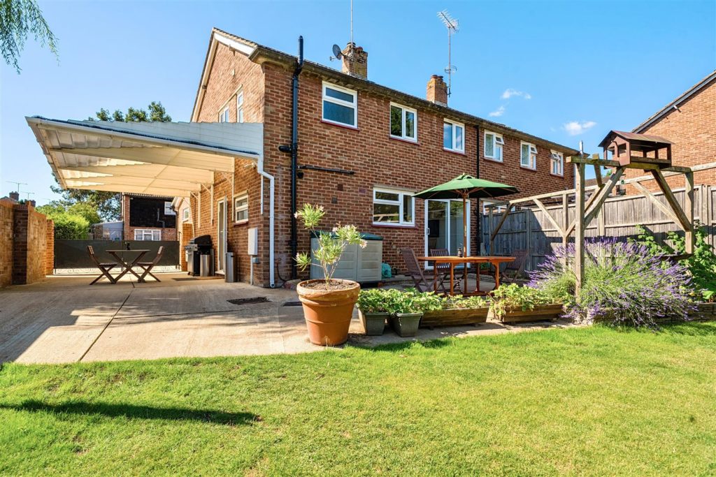 To the front, the property benefits from ample off-street parking and a small lawn, while a covered side area offers shaded seating or useful space for bikes and general storage. Gated side access allows for potential vehicular entry to the garden, adding further flexibility to this already versatile home.