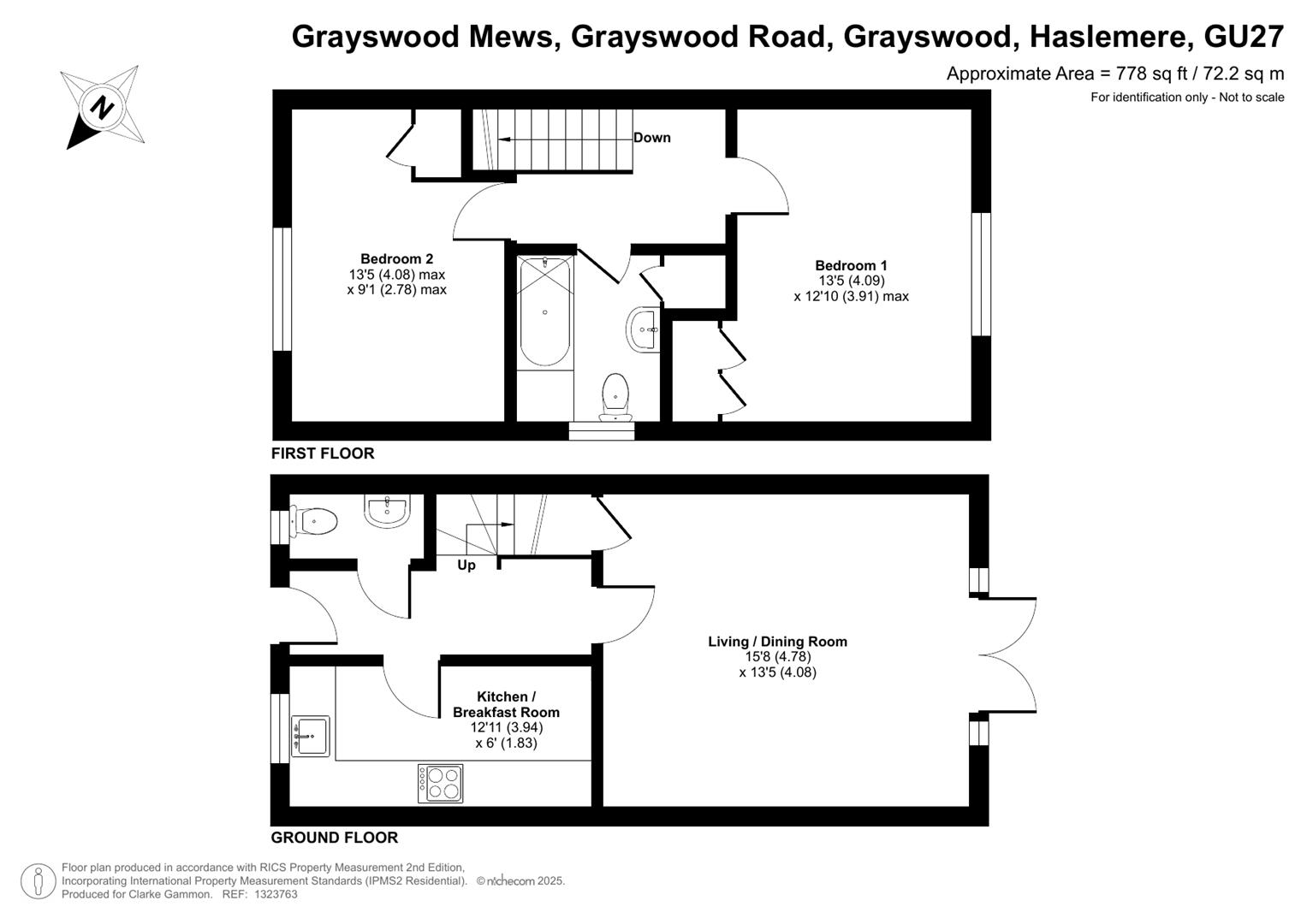 Built in 1999, the current homeowner is the 2nd custodian and was particularly drawn by the private setting, access to local villages and good transport links. On the ground floor there is modern durable flooring running from the hall through into kitchen/dining area, whilst off the hall there is a useful WC and under-stairs cupboard providing useful storage. In the fitted kitchen there is plumbing for a washing machine and dishwasher including space for an under cupboard fridge or freezer. Throughout there is double glazing and gas central heating whilst the bathroom is part tiled with matching pedestal wash hand basin suite, a close coupled w.c., a panelled bath with Aqualisa Aquastream shower, mixer taps/hand shower, convector radiator and a built in airing cupboard with lagged hot water tank.Both bedrooms are doubles with the master located to the rear benefitting from a discreet, large built in wardrobe, (one side with double level hanging rail) and second also benefitting from a built in wardrobe cupboard. From the living room there are French doors directly accessing the small, decked garden space where the communal grounds are also accessible, all surrounded by mature planting offering good privacy. Annual service charge for upkeep of communal grounds, electric gates, external lighting and liability insurance is circa £1,200 per annum.