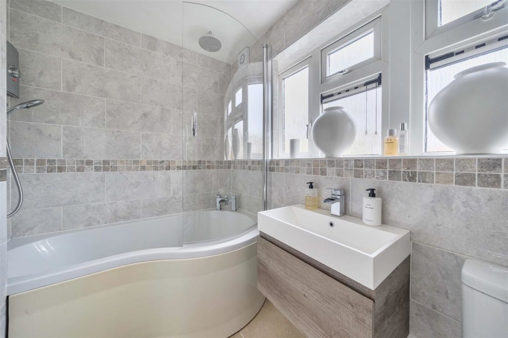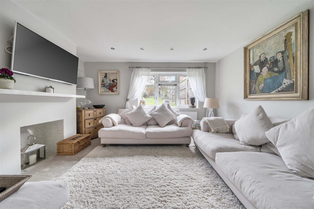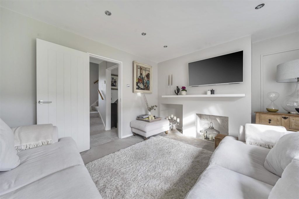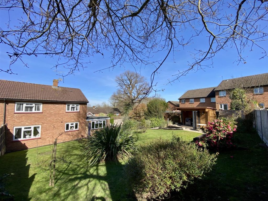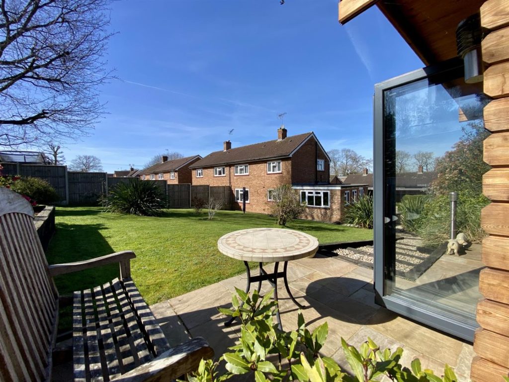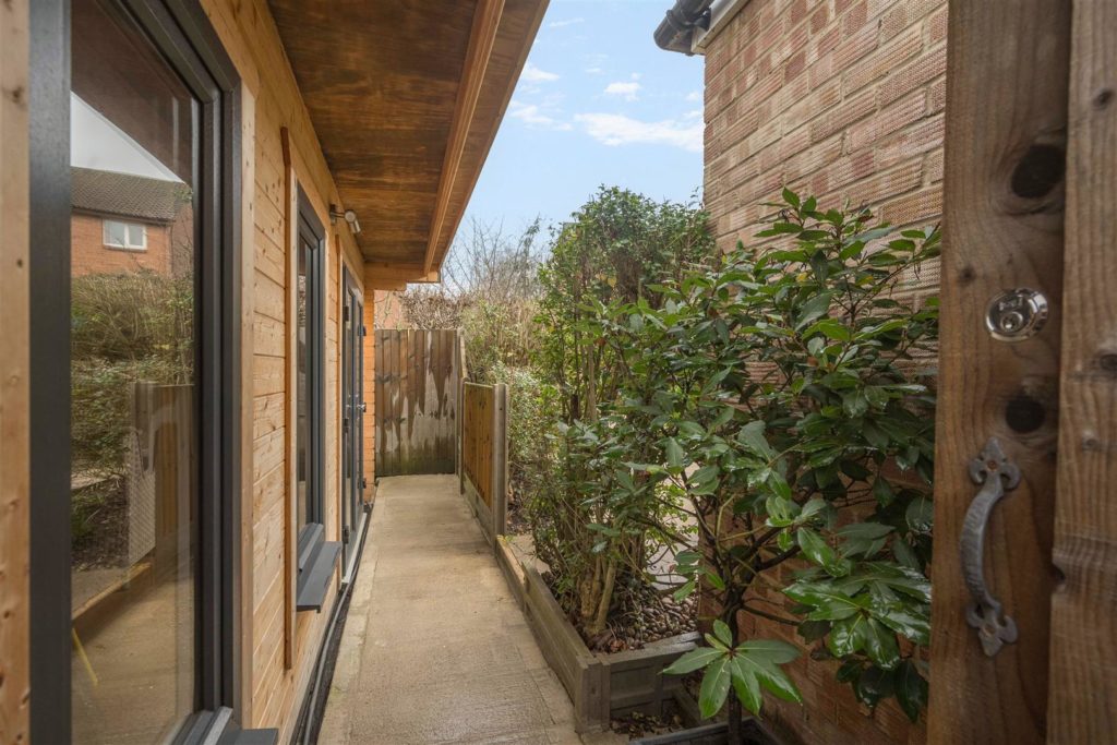 A well-presented/extended three-bedroom end of terrace situated on a DOUBLE PLOT offering generous living space and with landscaped garden facilities.Ideally located in catchment for sought after primary and secondary schools, this desirable home offers generous living space, superb garden space, a fully insulated/powered home cabin and a summer house/sauna with bi-folding doors/elevated view of the garden. Set away from the road, the property enjoys a sense calm, structure and space rarely found in this popular residential area.A welcoming hallway provides the perfect introduction to the home, with stairs rising to the first floor. To the rear, a bright and inviting living room features a large picture window overlooking the garden and a fireplace with mantelpiece forming a focal point within the room.The kitchen is fitted with modern white units and complementary worksurfaces, with an integrated electric oven and hob with cooker hood over, a single sink, and space for a freestanding dishwasher. Connected to the kitchen is a versatile/additional room currently arranged as a study offering excellent flexibility as a snug, playroom or nursery. Access via the kitchen to the additional ground floor accommodation opens up to an impressive dual-aspect family/dining room with great space for entertaining including patio doors directly opening onto the patio/garden. Upstairs, natural light fills the landing space leading to two double bedrooms and a comfortable single bedroom. The modern white family bathroom is fully tiled and fitted with a P-shaped bath/shower, basin with integrated storage, WC, heated towel rail and a mirror.