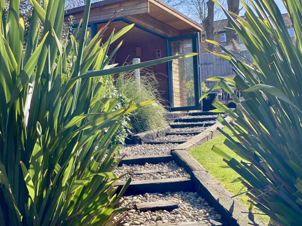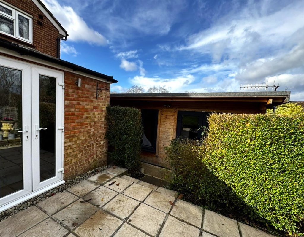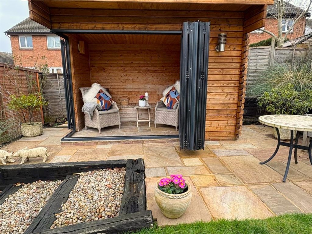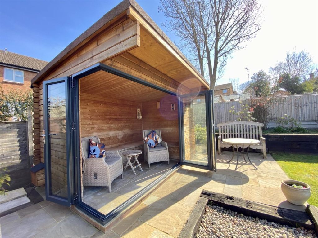 The plot also benefits from two high-quality log cabins. The first, positioned close to the house, is equipped with plumbing and electricity—perfect as a garden room, home office or gym. The second is configured as a sauna and garden room, featuring bi-folding doors opening onto its own patio area. A separate garden shed provides additional storage, and there is direct side access into the garden.