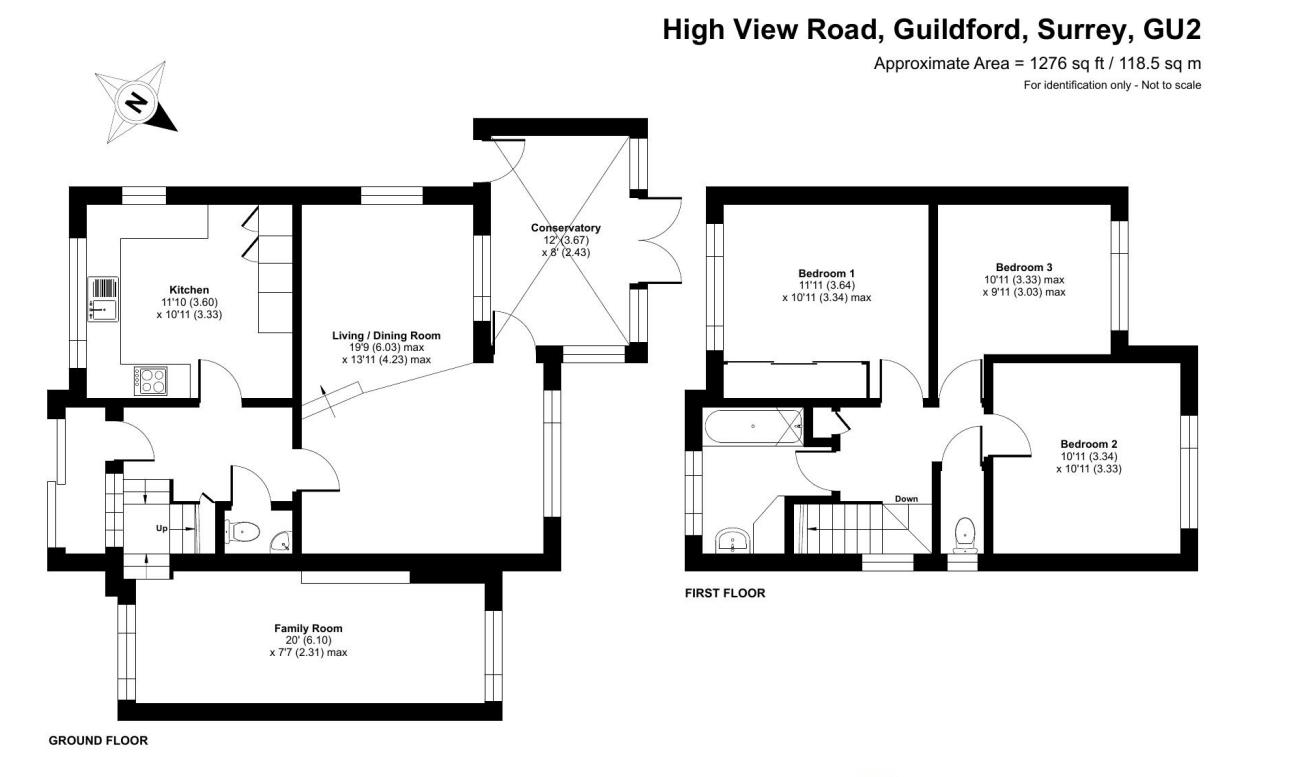 Set on High View Road, this detached three double bedroom home offers a private driveway for two cars and an adapted ground floor for more useful reception space.From the front door into the wide hallway, access leads to the living room, kitchen and family room, with advantage of understairs storage and a downstairs cloakroom. The kitchen is located at the front and is fitted with beech-effect units, laminate work surfaces, an integrated electric oven, a five-ring gas hob with cooker hood above, a stainless-steel sink with drainer, space for a freestanding dishwasher and washing machine, and provision for an American-style fridge-freezer. A large picture window overlooks the front, and there is a side door providing external access. The original garage has been converted to form an additional reception room, currently arranged as a media or family room, and could also be used as a home office or snug.To the rear, the main living room offers combined sitting and dining space with a large picture window facing the garden. A door leads into the conservatory, which provides further living space and direct access to the rear garden. There is scope for a rear extension, subject to the usual planning consents.On the first floor, there are three well-sized double bedrooms served by a bathroom fitted with a basin and bath with shower over, along with a separate WC across the landing.Outside, the conservatory opens onto a patio with steps down to the main garden, which is predominantly laid to lawn and enclosed by established boundaries. A garden shed is located at the far end of the plot.
