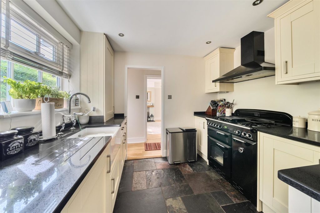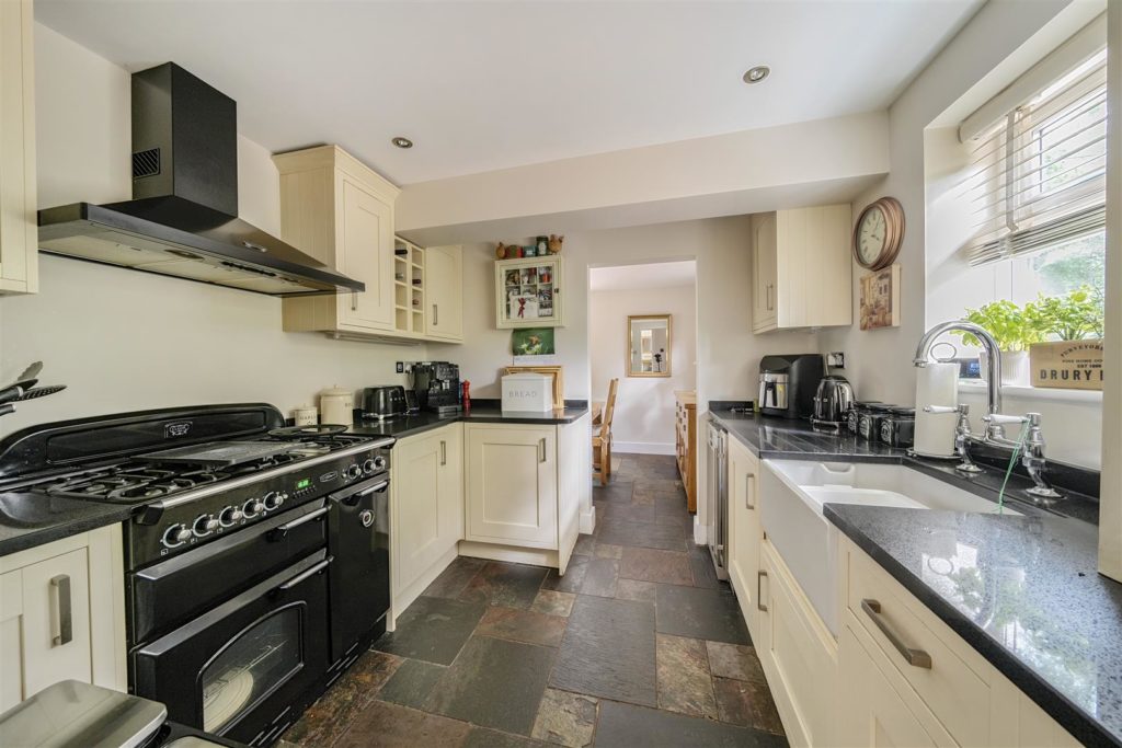 - Stylish kitchen with cream shaker units, black quartz worktops, Rangemaster oven, and Belfast sink