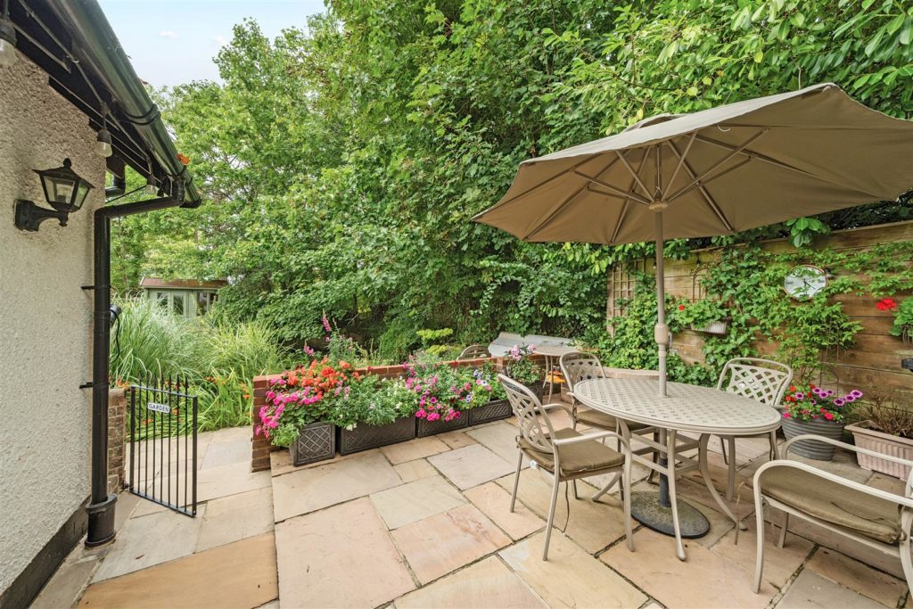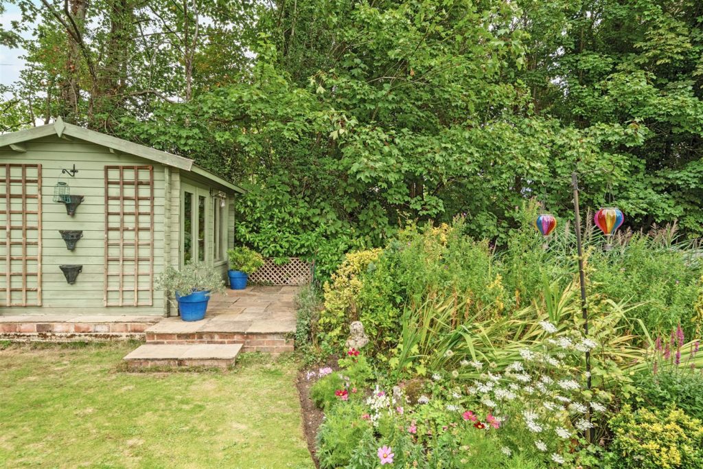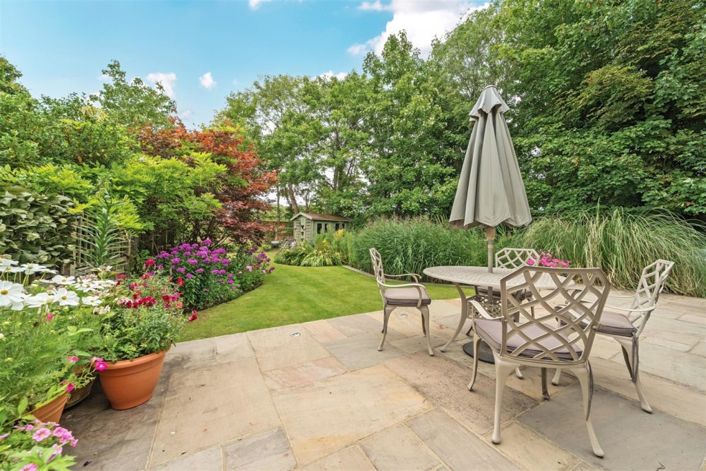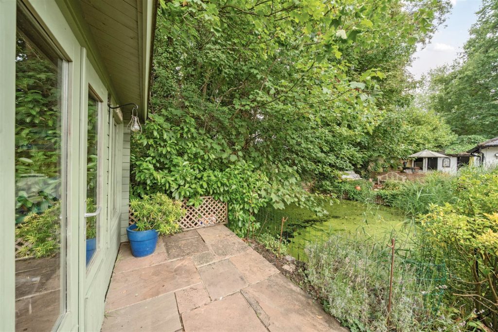 A substantial pond adds a tranquil focal point, while a large patio wraps around the side of the property, accessible via French doors from the living room. At the far end of the garden, a generous summer house with its own terraced area offers excellent potential as a home office or garden room.