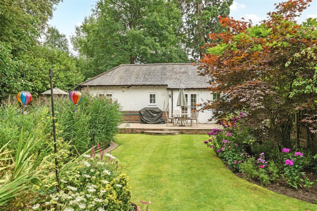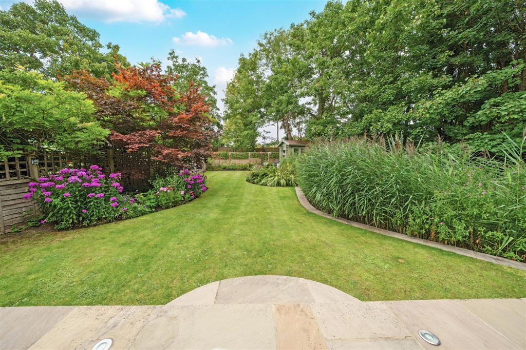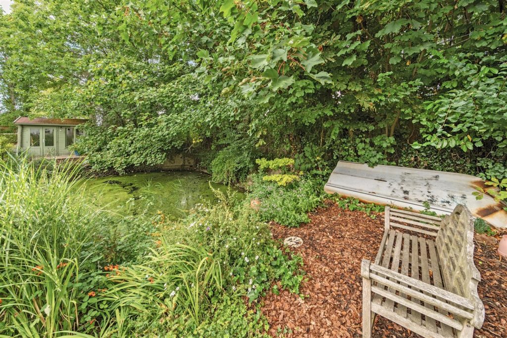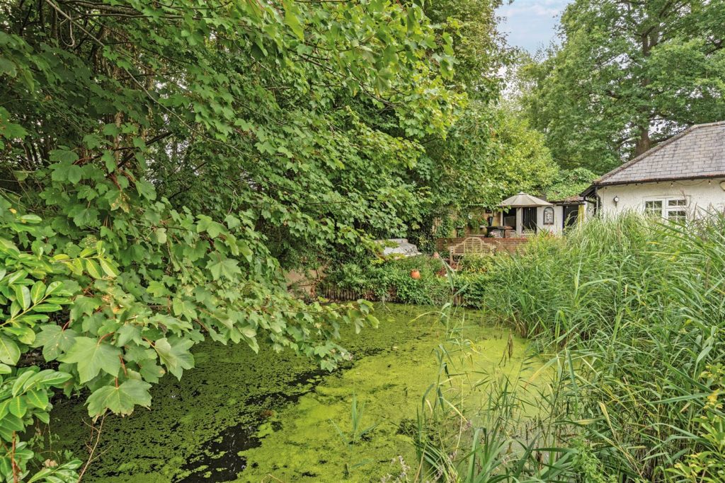 - Beautifully maintained garden extending to approx. 80 feet, with lawn, mature borders, and a substantial pond
