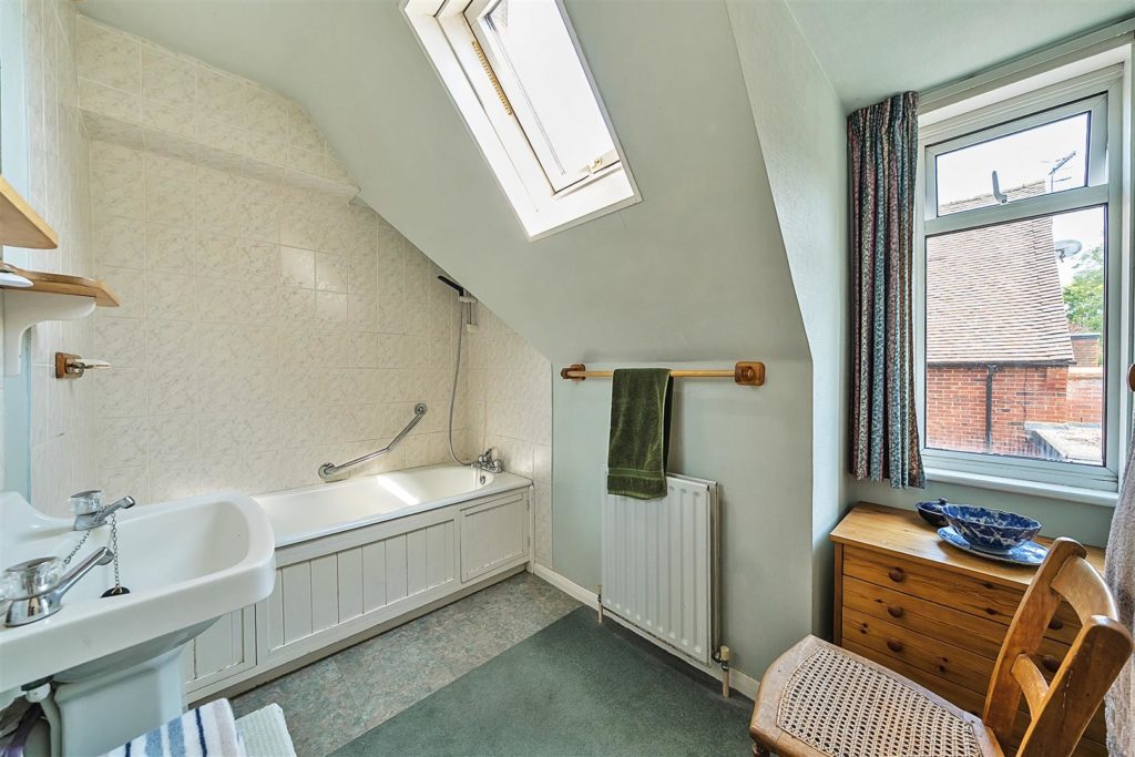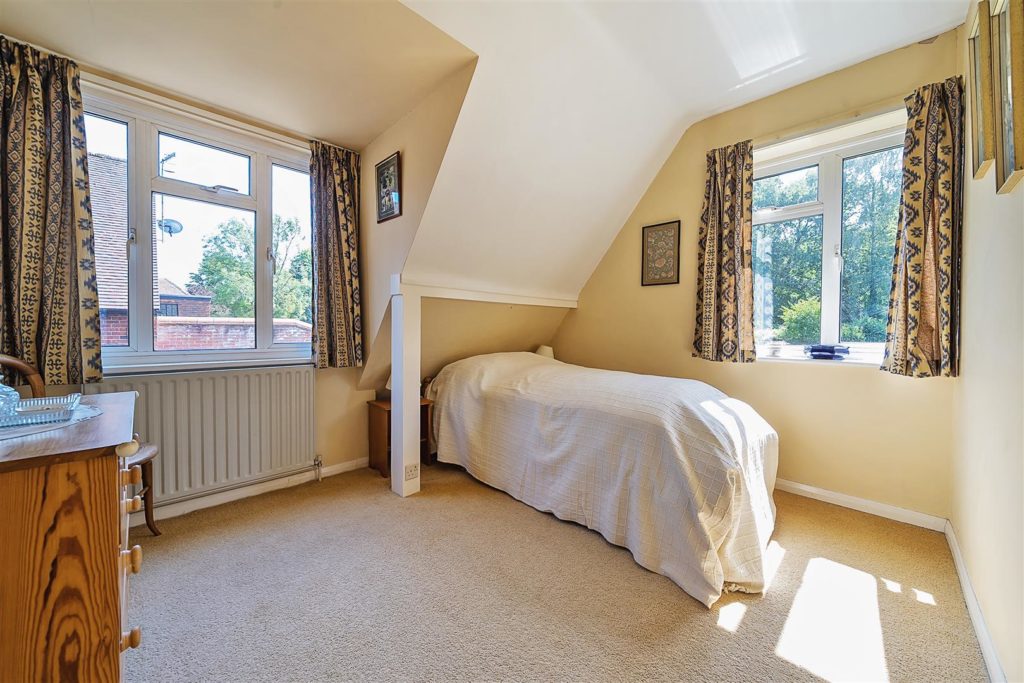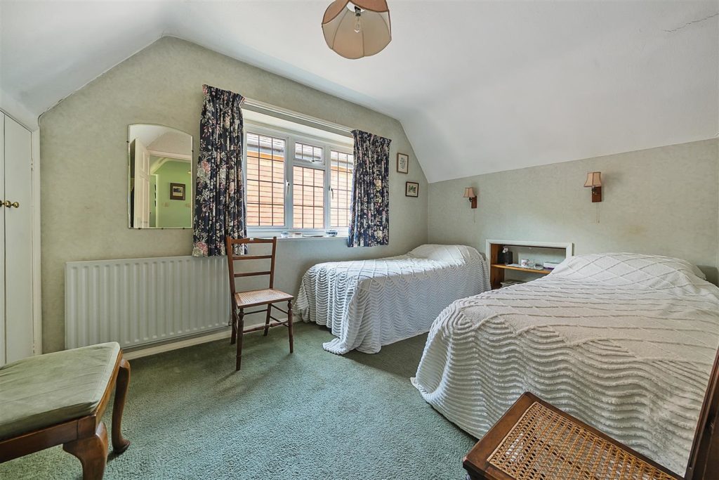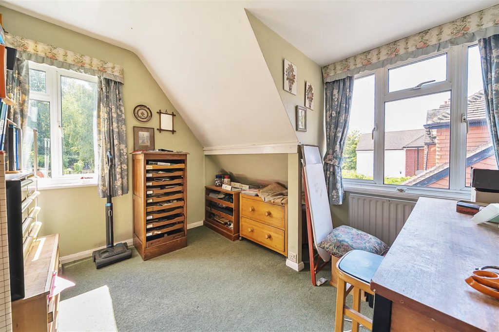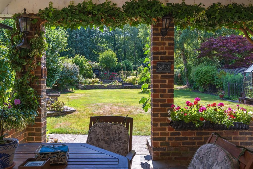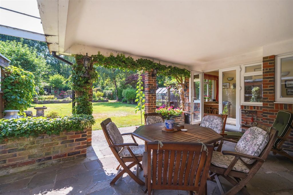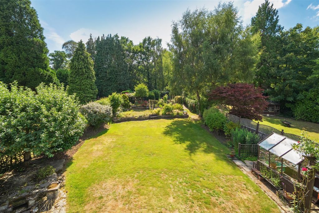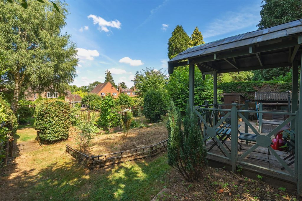The tandem garage, equipped with power and lighting, has long served as a workshop. There is also an external WC and wash basin for added convenience. The front garden is laid to lawn with mature planting, and a gravel driveway provides ample parking for multiple vehicles. To the rear, the south-westerly facing garden is a true highlight. Extending to approximately 135 feet, it backs directly onto the Downs Link, a former railway line now popular with walkers and cyclists, with gated access from the garden. In the early 1960s, the owners’ children would wave to passing trains from the top of the garden—a tradition fondly remembered. Today, the garden is beautifully tiered and thoughtfully landscaped, with mature borders that provide colour throughout the year, a greenhouse, potting sheds, and a peaceful seating area at the top, offering views back toward the house.