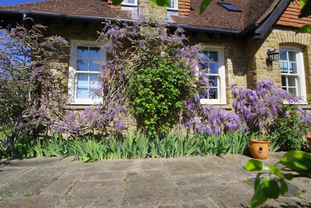 The mature and secluded garden is a true highlight of this property, with wisteria draped along one of the external walls, rose beds, fig trees, loganberries, and raspberries. The garden also features direct access from the front of the property and enjoys views of the Loseley Estate. A terrace area, accessible from the kitchen and dining room, provides a perfect space for relaxing or entertaining. Discovery and Cox apple espaliers are well-designed to give the terrace natural delineation from the lawn below.