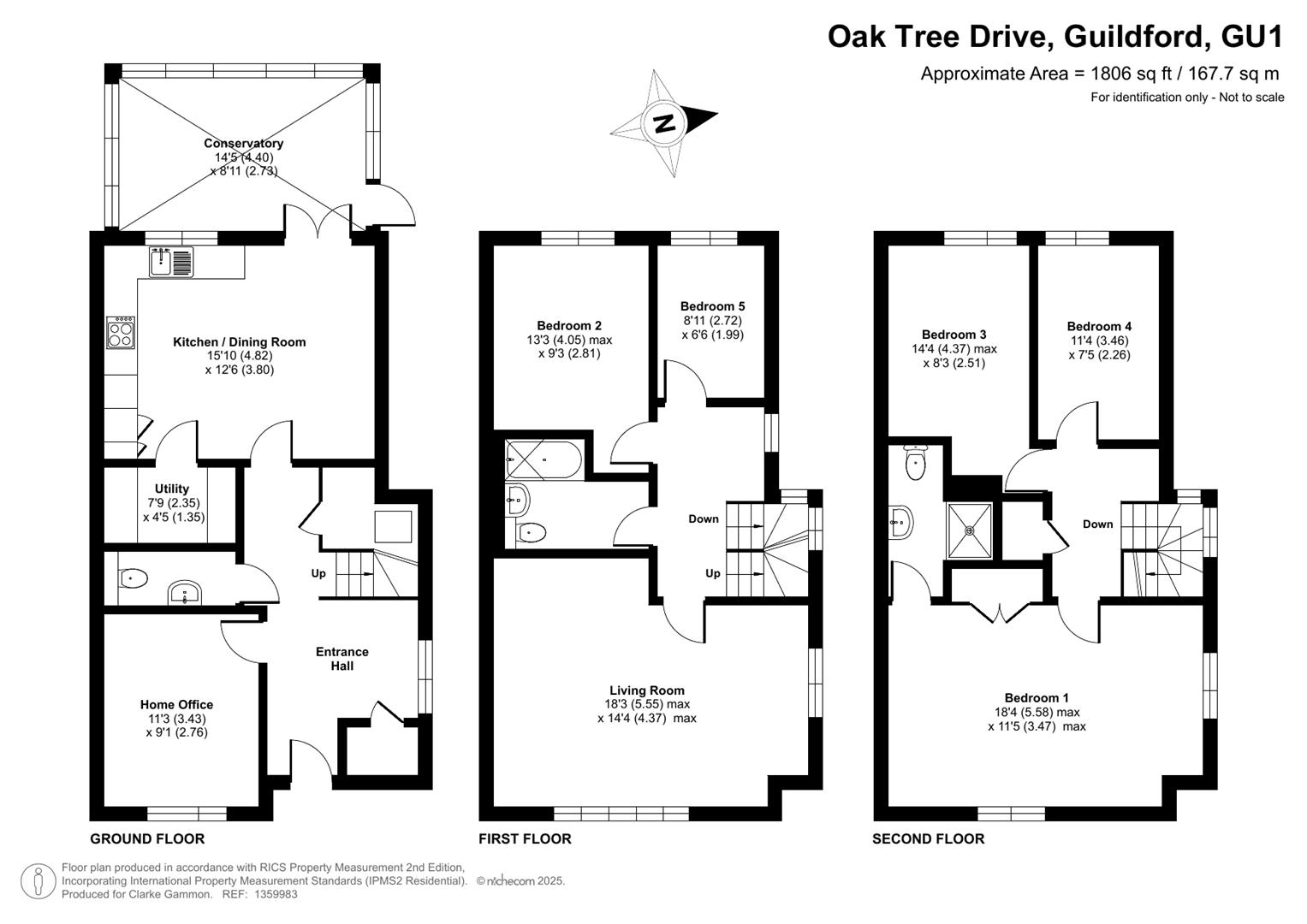 28 Oak Tree Drive offers spacious and flexible accommodation arranged over three floors, totalling over 1,800 square feet. The property is approached via a smart resin driveway, providing off-street parking for two vehicles. Upon entering, you are welcomed into a bright and spacious hallway featuring understairs storage, a separate storage cupboard, and a downstairs cloakroom.To the front of the property is a versatile home office, ideal for remote working or study. At the rear, a stylish grey shaker-style kitchen provides ample space for dining and entertaining. The kitchen is well-equipped with two eye-level ovens, an induction hob with cooker hood above, a wine fridge, dishwasher, and a stainless steel sink with drainer. Adjacent to the kitchen is a practical utility room with space and plumbing for a freestanding washing machine and tumble dryer. A conservatory leading from the kitchen overlooks the garden and is currently arranged as a formal dining room.Ascending to the first floor, you’ll find a generously proportioned double-aspect living room with a large front-facing window that frames far-reaching views towards the Surrey Hills. This floor also has two bedrooms: a double bedroom and a single bedroom currently used as a study. Both are served by a recently fitted, fully tiled three-piece bathroom suite comprising a toilet, vanity unit with basin, bath with shower over, and a lighted mirror.The second-floor features three further bedrooms, two of which are double bedrooms and a spacious master bedroom. The master bedroom benefits from a double aspect, built-in wardrobes, and a modern en-suite shower room with a three-piece suite.To the rear of the property is a well-maintained, low-maintenance garden with an evergreen shrub border and a paved patio area, perfect for outdoor relaxation. To the side of the garden is a separate carport and sheds, and the property also enjoys the convenience of side access.