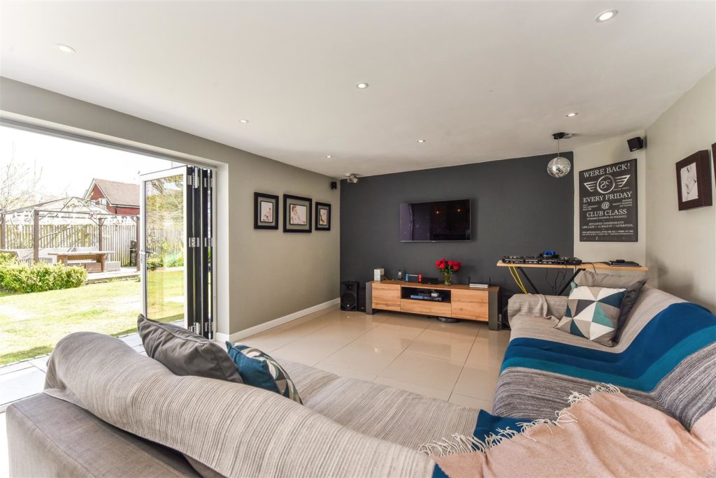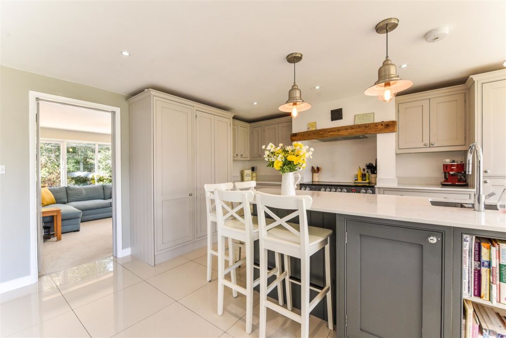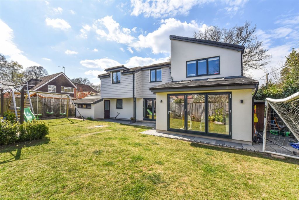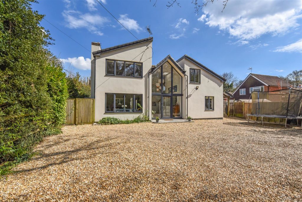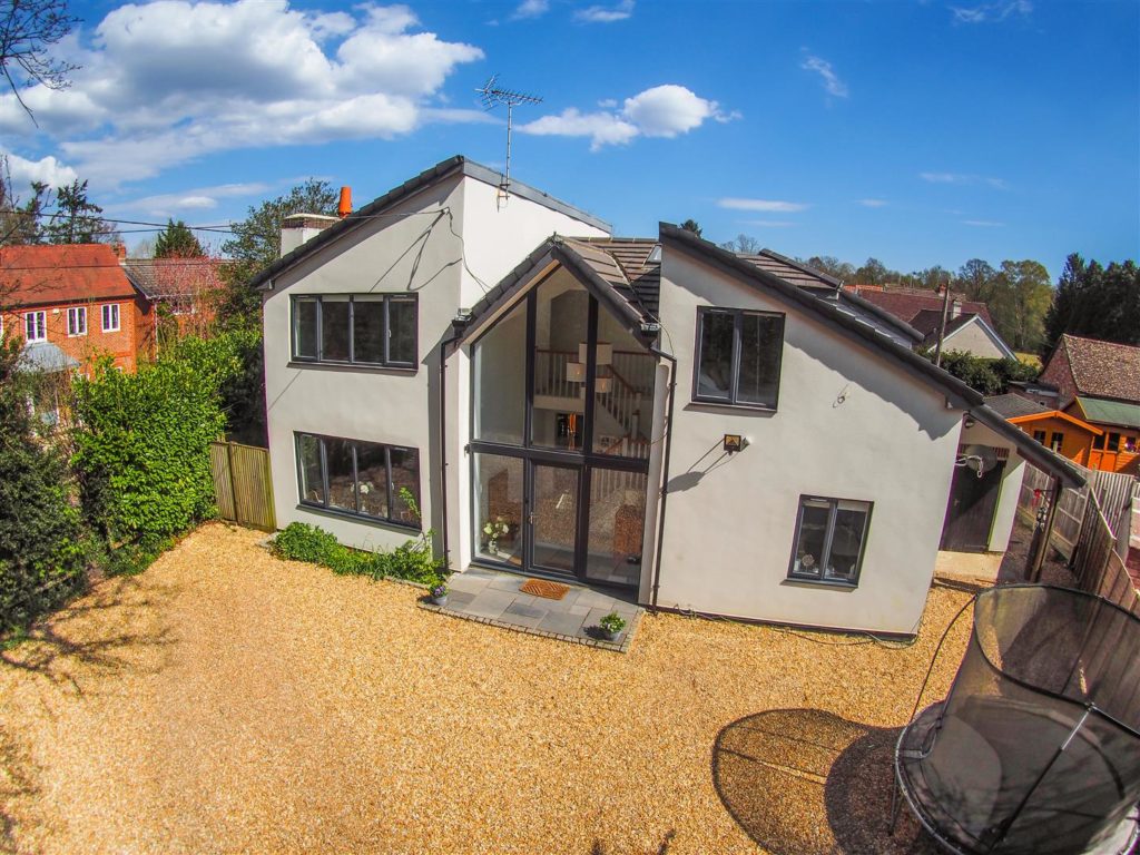 This impeccable house, with clean lines and light filled rooms throughout, offers modern, stylish living with the countryside on the doorstep. The striking entrance hall leads to a magnificent reception area incorporating lounge, kitchen, and dining space. With twin double glazed bifold doors out to the sun-drenched garden, this offers a wonderful entertaining space. The bespoke handmade kitchen in Tulip wood boasts concealed appliances including Miele dishwasher, Liebherr fridge/freezer, plus Rangemaster induction oven, wine cooler and the sink has an additional Quooker boiling tap. In contrast, when the nights draw in, retire to the cosy sitting room with stunning open fire. Off the reception hall there is access to the study/bedroom and ground floor shower room. A feature staircase leads to a galleried first floor landing. The master bedroom features a range of fitted storage cupboards and a luxuriously appointed en-suite. There are four further double bedrooms and a beautifully appointed family bathroom. The current owners have extended and extensively refurbished the property with re-wire, re-plumb, including mega flow type system and underfloor heating to tiled ground floor, plus new windows, and roofing. For the homeworker, in the rear garden lies a useful home office/cabin with light and power.  Double opening garage doors leads to the former garage space again with light and power. There is extensive shingled parking to the front of the property, whilst to the rear paved terracing including a small, covered area leads to a level area of lawn with borders and further raised paved sun terrace.