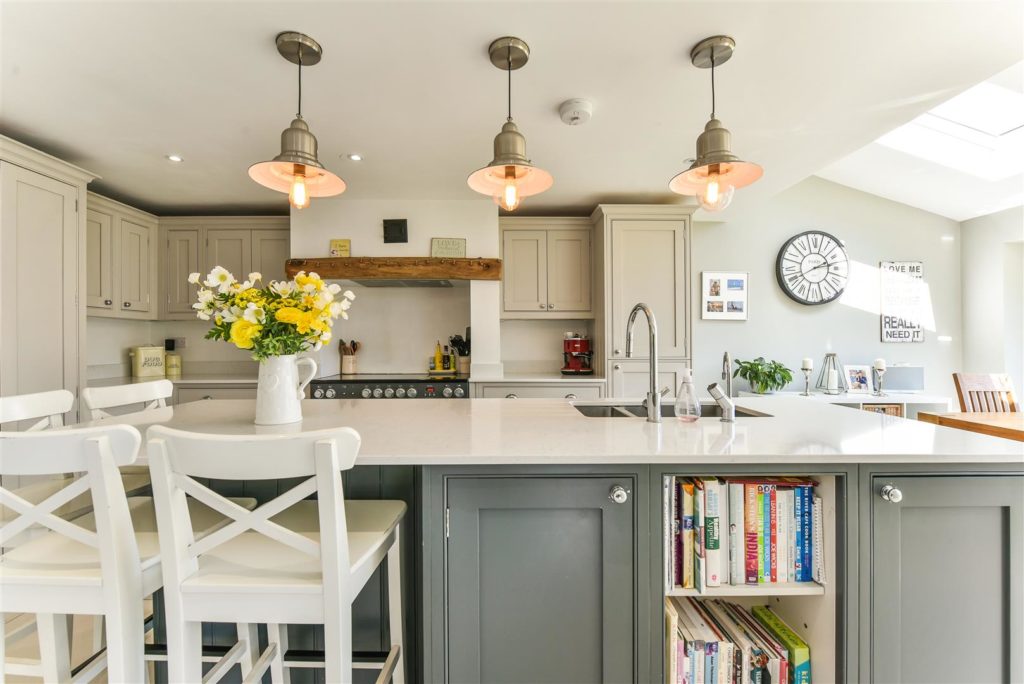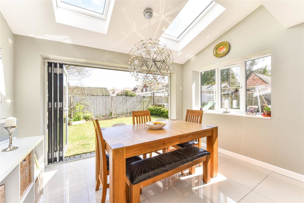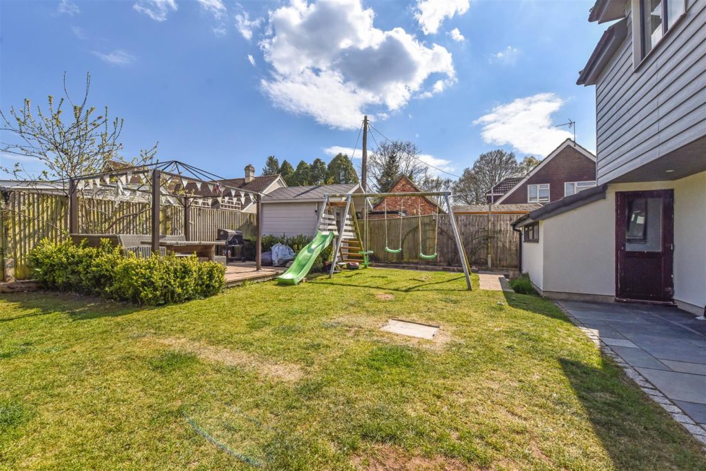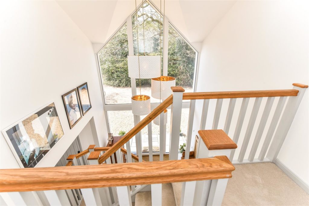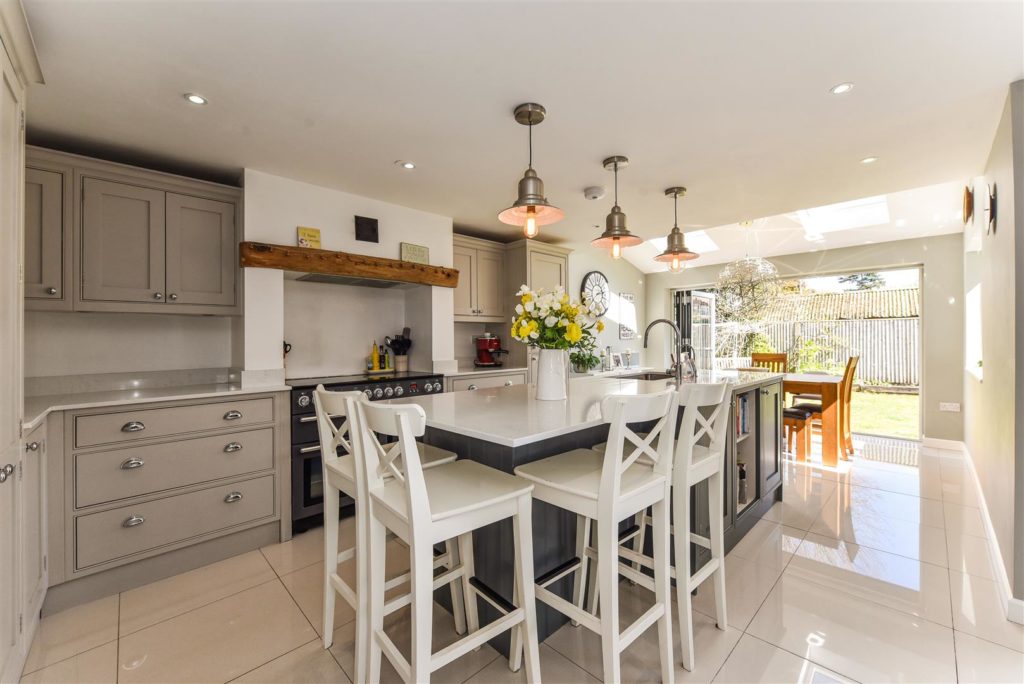 This impeccable house, with clean lines and light filled rooms throughout, offers modern, stylish living with the countryside on the doorstep. The striking entrance hall leads to a magnificent reception area incorporating lounge, kitchen, and dining space. With twin double glazed bifold doors out to the sun-drenched garden, this offers a wonderful entertaining space. The bespoke handmade kitchen in Tulip wood boasts concealed appliances including Miele dishwasher, Liebherr fridge/freezer, plus Rangemaster induction oven, wine cooler and the sink has an additional Quooker boiling tap. In contrast, when the nights draw in, retire to the cosy sitting room with stunning open fire. Off the reception hall there is access to the study/bedroom and ground floor shower room. A feature staircase leads to a galleried first floor landing. The master bedroom features a range of fitted storage cupboards and a luxuriously appointed en-suite. There are four further double bedrooms and a beautifully appointed family bathroom. The current owners have extended and extensively refurbished the property with re-wire, re-plumb, including mega flow type system and underfloor heating to tiled ground floor, plus new windows, and roofing. For the homeworker, in the rear garden lies a useful home office/cabin with light and power.  Double opening garage doors leads to the former garage space again with light and power. There is extensive shingled parking to the front of the property, whilst to the rear paved terracing including a small, covered area leads to a level area of lawn with borders and further raised paved sun terrace.