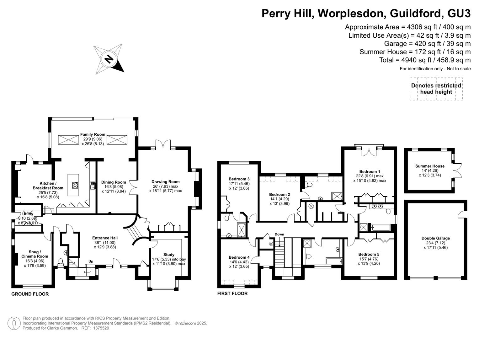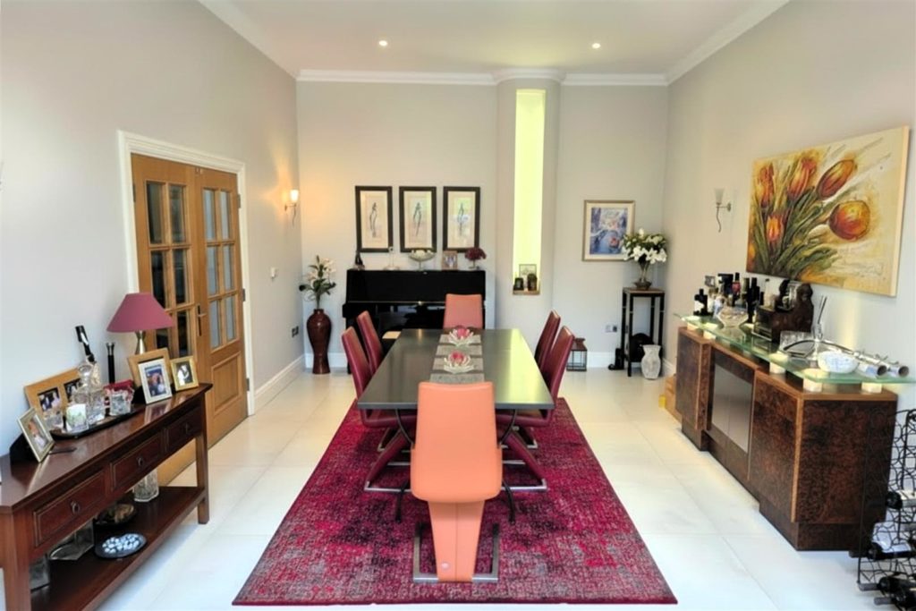 Rose House is an exceptional family home, comprehensively modernised and extended by the current owners to create a luxuriously appointed residence of outstanding quality. Set in a semi-rural location on a beautifully landscaped plot of approximately 0.57 acres, this striking property combines traditional architectural character with contemporary design and offers accommodation finished to an exacting standard throughout.Approached via a private driveway shared with only two other houses, the property enjoys an attractive frontage with ample parking and a detached double garage. Its exterior is distinguished by a clay-tiled roof, red brick and flint elevations, and a prominent gable end with intricate detailing, complemented by a covered porch. Inside, an impressive hallway with an oak front door and Sicilian granite tiled flooring sets the tone for the home. The hallway includes a cloakroom with vanity unit, a storage cupboard by the entrance, an additional cupboard under the stairs, and an elegant oak staircase rising to the first floor beneath a chandelier and a large front-facing window.The ground floor offers a flexible layout with multiple reception rooms designed for both family life and entertaining. The study features a built-in desk, cabinetry, and a bay window, while the snug / cinema room is equipped with a remote-controlled gas fireplace, blackout blinds, projector, speakers, and subwoofers. From the hallway, steps lead down through double doors into the drawing room, which features bespoke illuminated cabinetry, a sunken ceiling, a central gas fireplace, and doors opening onto the rear patio. Double doors flow into the formal dining room, which in turn leads into the family room—a light-filled space with two roof lanterns, sliding doors to the garden, and integrated Sonos surround sound.
