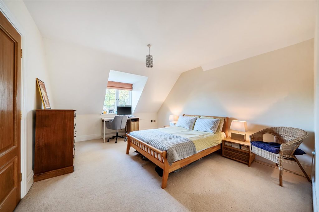 Upstairs, the oak staircase leads to a spacious landing with two airing cupboards and loft access. The principal suite enjoys a Juliet balcony overlooking the garden, a dressing room with extensive built-in storage, and a luxurious five-piece en-suite bathroom with Aqualisa shower, double vanity basin, bath, and towel rail. Two further bedrooms have en-suite shower rooms, while the remaining bedrooms offer built-in storage and share a beautifully appointed family bathroom. Every shower in the house is a power shower with pump, and the specification includes underfloor heating throughout, Cat 7 cabling, and a Sonos system.