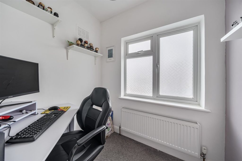 - First floor offers two double bedrooms, modern bathroom, and a home office