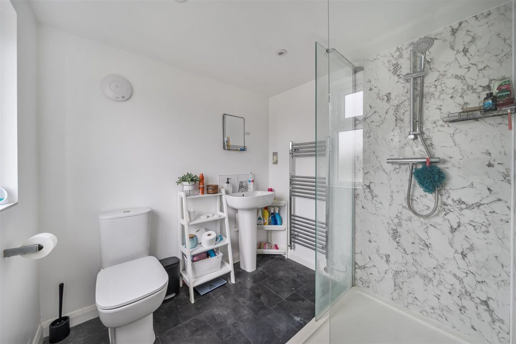 14 Saffron Platt in Guildford is an impressive three-bedroom property that has been thoughtfully extended and beautifully finished to create a stylish and practical family home. To the front, a shared driveway provides off-street parking on a gravel surface. The entrance opens into an extended hallway that allows space for a downstairs cloakroom. There is a useful cupboard under the stairs along with two additional storage cupboards, one of which serves as a utility cupboard housing the washing machine. The heart of the home lies in the stunning extended kitchen and dining space at the rear, featuring bi-folding doors that open onto the south-easterly facing garden and two Velux windows that flood the room with natural light. The kitchen is fitted with modern white shaker-style units with chrome handles, complemented by a grey quartz worktop, and includes a large island with a breakfast bar, single sink and drainer, and integrated dishwasher. Further integrated appliances include a fridge freezer, single electric oven, and a five-ring gas hob with a cooker hood above. Flowing from the kitchen diner to the front of the property is a welcoming living room with a feature fireplace, creating a cosy space to relax. On the first floor, there are two generous double bedrooms, one benefiting from integrated storage, served by a contemporary three-piece bathroom with bath and shower over, basin, and toilet, finished with modern white tiling and chrome fittings. A further room on this floor provides an ideal home office. The second floor is dedicated to a superb master bedroom within the converted loft space, offering excellent proportions with space for a super king bed, two Velux windows, eaves storage, and a stylish en-suite shower room with a large shower, basin, and toilet.