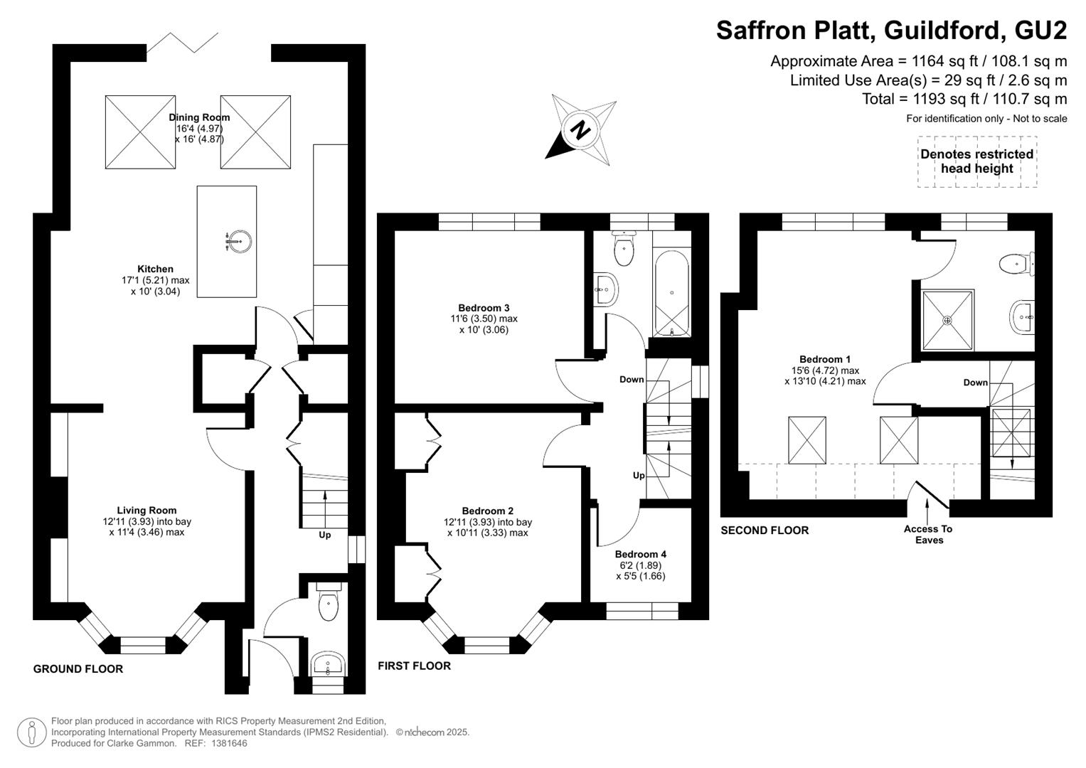 14 Saffron Platt in Guildford is an impressive three-bedroom property that has been thoughtfully extended and beautifully finished to create a stylish and practical family home. To the front, a shared driveway provides off-street parking on a gravel surface. The entrance opens into an extended hallway that allows space for a downstairs cloakroom. There is a useful cupboard under the stairs along with two additional storage cupboards, one of which serves as a utility cupboard housing the washing machine. The heart of the home lies in the stunning extended kitchen and dining space at the rear, featuring bi-folding doors that open onto the south-easterly facing garden and two Velux windows that flood the room with natural light. The kitchen is fitted with modern white shaker-style units with chrome handles, complemented by a grey quartz worktop, and includes a large island with a breakfast bar, single sink and drainer, and integrated dishwasher. Further integrated appliances include a fridge freezer, single electric oven, and a five-ring gas hob with a cooker hood above. Flowing from the kitchen diner to the front of the property is a welcoming living room with a feature fireplace, creating a cosy space to relax. On the first floor, there are two generous double bedrooms, one benefiting from integrated storage, served by a contemporary three-piece bathroom with bath and shower over, basin, and toilet, finished with modern white tiling and chrome fittings. A further room on this floor provides an ideal home office. The second floor is dedicated to a superb master bedroom within the converted loft space, offering excellent proportions with space for a super king bed, two Velux windows, eaves storage, and a stylish en-suite shower room with a large shower, basin, and toilet.