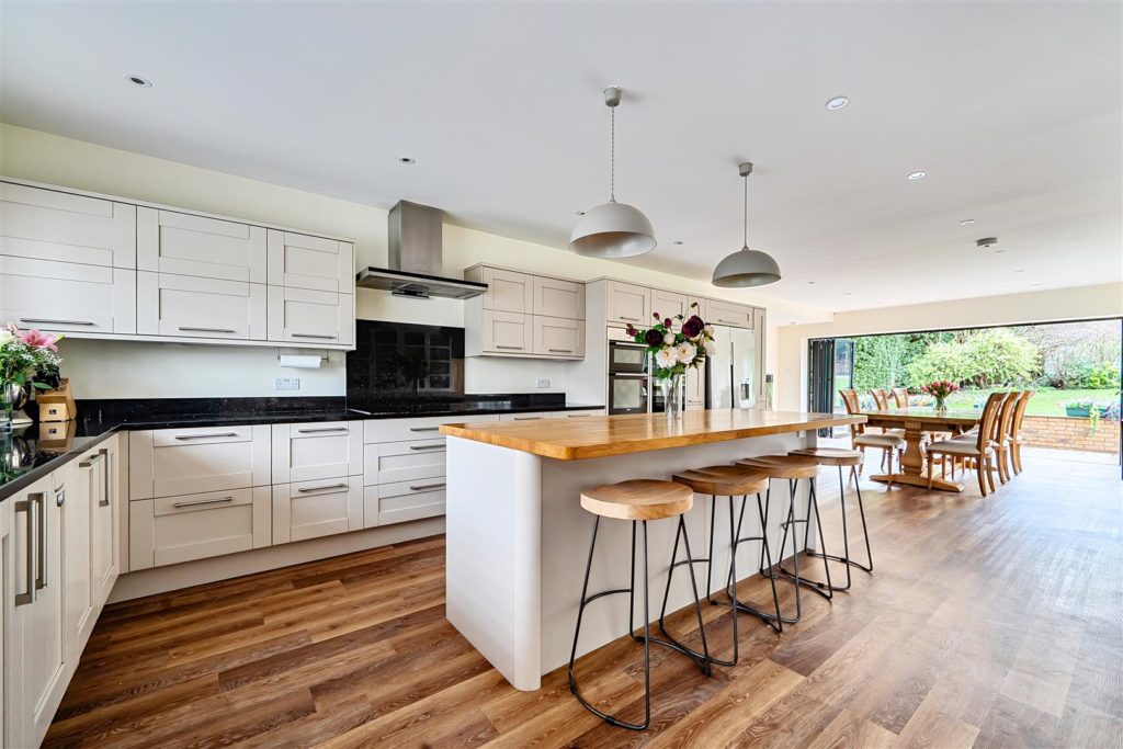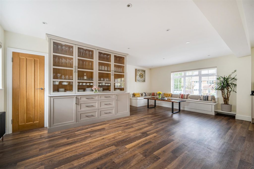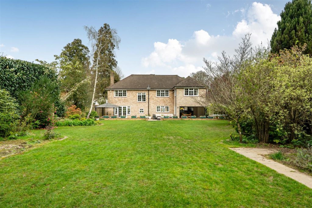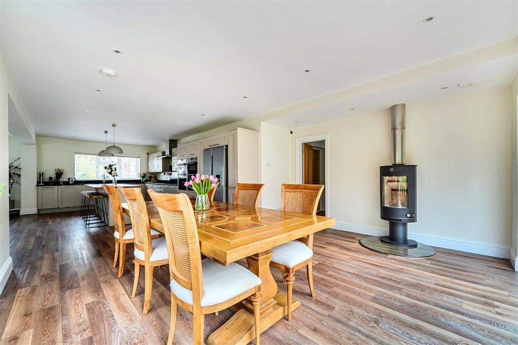 A significant and highly sought after detached family house which has been substantially enlarged and adapted to a very high standard, it occupies an established position on the highly regarded ‘Berg development’ which is walking distance of the village Centre, mainline station and large areas of regarded countryside. It offers flexible and open plan accommodation which is tastefully presented with high-quality fixtures and fittings. The whole of the house is fitted with high-quality wood style flooring; there is a good size entrance Hall with walk-in storage cupboard and cloakroom. There is a pair of glazed doors which leads to the double aspect sitting room with its featured open fireplace & patio doors that leads to the Sun Terrace and rear garden. There is a matching door which leads to the impressive open plan living space offering kitchen area, family area and dining area. The kitchen is extensively equipped with high-quality units with matching island breakfast bar and excellent range of electrical appliances. In the family area there is an impressive matching dresser unit and large L shaped bench seating. The dining area is excellent size with a feature woodburning stove and full width range of bifold doors which leads into the rear garden. The utility room is well equipped and gives access to the double garage.Externally the front garden is open plan and in keeping with the original design of the development. It is laid to lawn with a feature footpath and there is parking for six cars which leads to the double garage. The rear garden is a fine feature, it is an excellent size, offering a full width and deep Sun Terrace. There is a large retaining wall and flight of steps which lead to the large lawn area which is well maintained and surrounded by well stocked flower borders and mature trees. The whole enjoys a high degree privacy; at the foot of the garden there is the log cabin/home office.