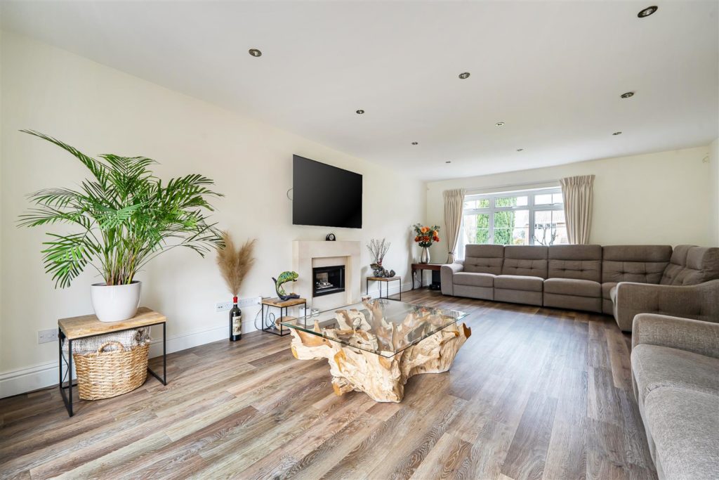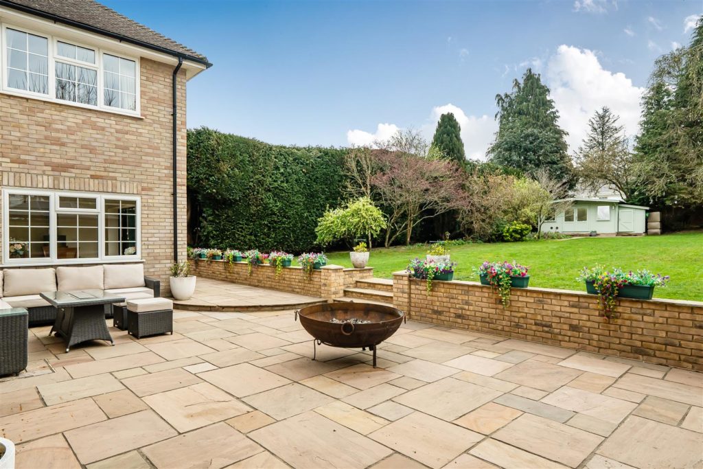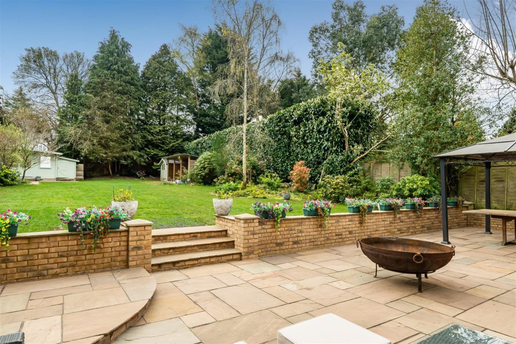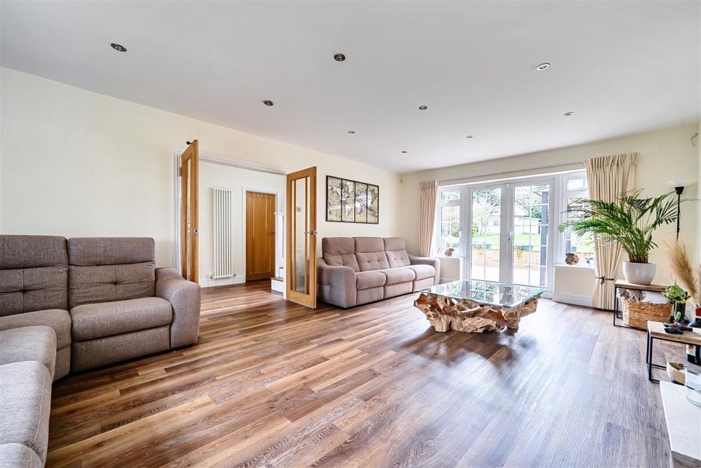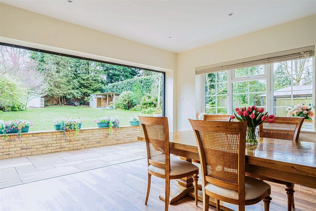 A significant and highly sought after detached family house which has been substantially enlarged and adapted to a very high standard, it occupies an established position on the highly regarded ‘Berg development’ which is walking distance of the village Centre, mainline station and large areas of regarded countryside. It offers flexible and open plan accommodation which is tastefully presented with high-quality fixtures and fittings. The whole of the house is fitted with high-quality wood style flooring; there is a good size entrance Hall with walk-in storage cupboard and cloakroom. There is a pair of glazed doors which leads to the double aspect sitting room with its featured open fireplace & patio doors that leads to the Sun Terrace and rear garden. There is a matching door which leads to the impressive open plan living space offering kitchen area, family area and dining area. The kitchen is extensively equipped with high-quality units with matching island breakfast bar and excellent range of electrical appliances. In the family area there is an impressive matching dresser unit and large L shaped bench seating. The dining area is excellent size with a feature woodburning stove and full width range of bifold doors which leads into the rear garden. The utility room is well equipped and gives access to the double garage.Externally the front garden is open plan and in keeping with the original design of the development. It is laid to lawn with a feature footpath and there is parking for six cars which leads to the double garage. The rear garden is a fine feature, it is an excellent size, offering a full width and deep Sun Terrace. There is a large retaining wall and flight of steps which lead to the large lawn area which is well maintained and surrounded by well stocked flower borders and mature trees. The whole enjoys a high degree privacy; at the foot of the garden there is the log cabin/home office.