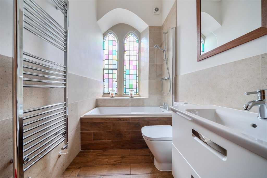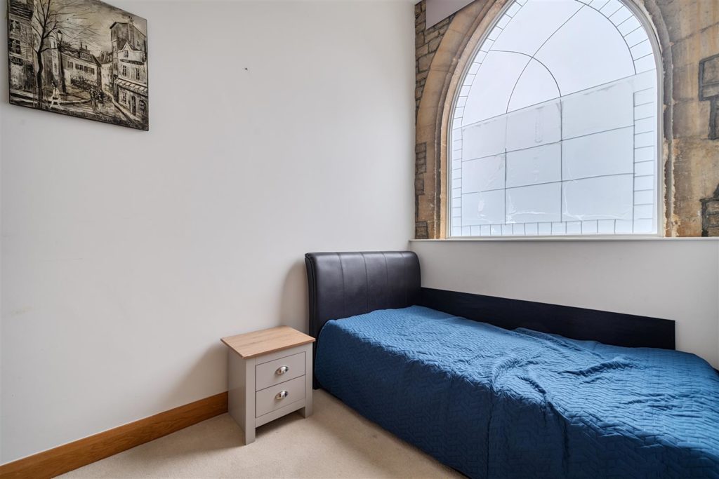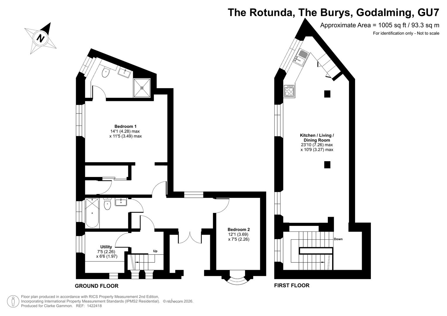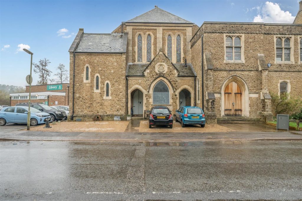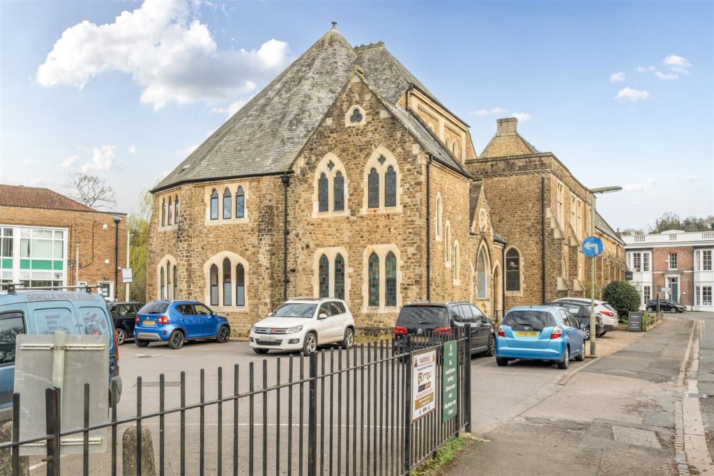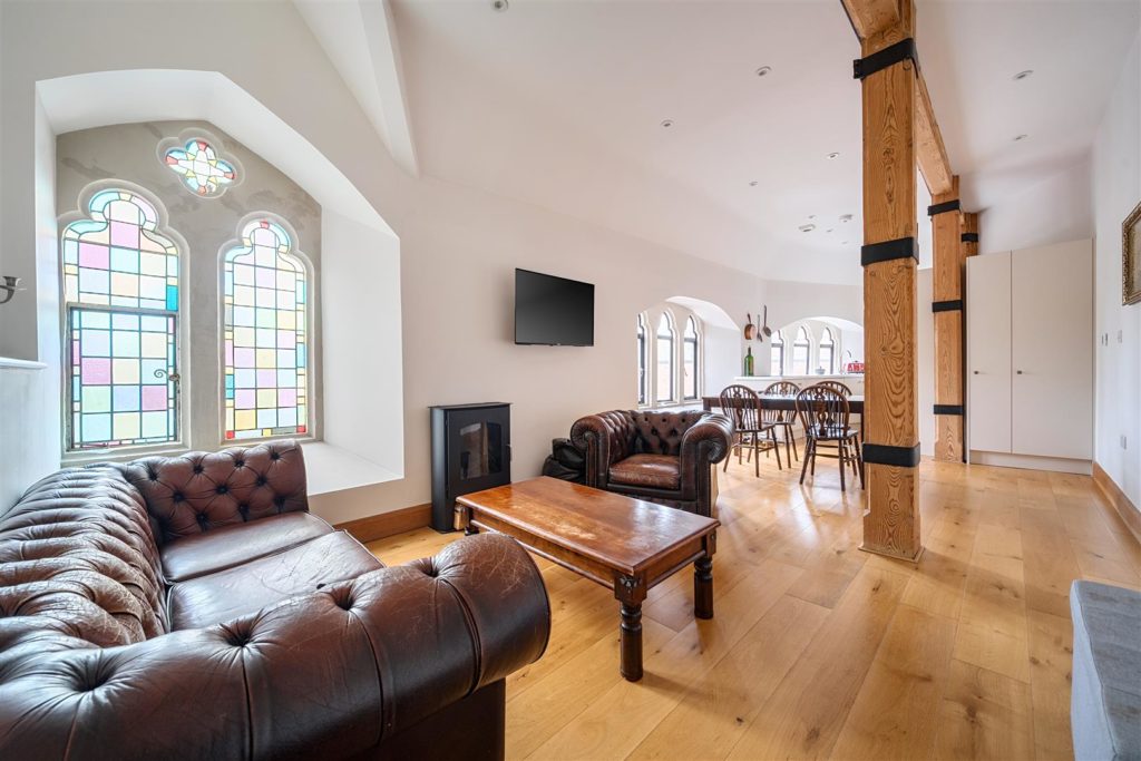 2 Rotunda forms part of the historic Grade II listed Rotunda building on The Burys in central Godalming, within easy reach of the High Street and mainline station. The Rotunda was constructed in 1883 by architect Samuel Welman using Bargate stone and was originally designed as a circular Sunday school with a domed roof, intended to allow pupils to see the teacher clearly from all angles. The wider Rotunda and Old Church complex has since been restored, with part of the Rotunda converted for residential. The property is offered with no onward chain and has dedicated parking to the front for 2 carsA porch to the front leads into the hallway. On the ground floor, there is a generous master bedroom with two built in wardrobe areas and an en suite shower room comprising a basin set within a vanity unit, a walk in shower and a WC. There is a further double bedroom served by a three piece bathroom, which includes a bath with shower over, WC, basin with vanity unit, heated towel rail and large stained glass windows. The utility room completes the ground floor accommodation.Stairs lead to a landing area currently arranged as a home office. On the first floor, there is an open plan kitchen and living area set within the original curved form of the Rotunda. The kitchen includes an induction hob, electric oven, built in microwave, fridge freezer and a single sink with drainer. The room retains features of the original structure, including large windows and stained elements that reference the building’s past.
