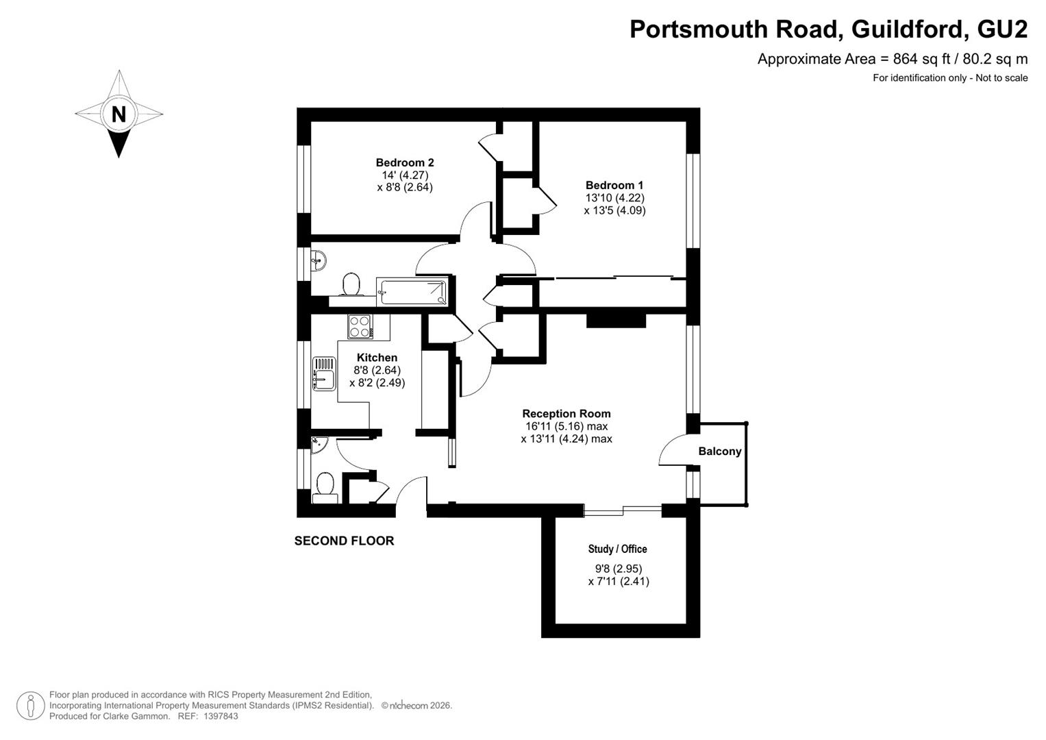 An excellent opportunity to purchase this desirable first floor flat, located in the established and well regarded Meadows development which is located within walking distance of Guildford town centre on the favoured south side of the town. The property offers an interesting layout to include a further reception room off the main reception room, along with a balcony which offers elevated views down to the river and beyond. Enviably situated 0.5 miles from Guildford town centre, which can be accessed by a particularly attractive walk through an established part of Guildford via quiet lanes/roads. Guildford main line station is also within walking distance, located approx. 0.6 miles away. The property is being sold with vacant possession and no onward chain. The accommodation comprises: Communal Hallway; Entrance Hall; Cloakroom; fitted Kitchen with integrated hob and oven; inner hallway; Bathroom; Bedroom 1 with wardrobe; Bedroom 2 with wardrobe; Main reception room with parquet flooring; and a further reception, possible Study/Office. A Garage is also included in the sale, conveniently situated to the front of the building. The property also affords uPVC glazing, gas warm air heating and all main services.