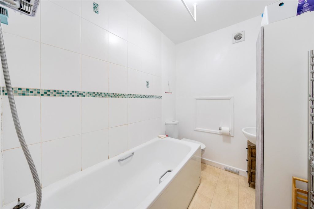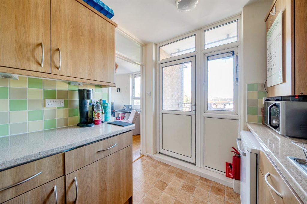 - Kitchen off the reception room with beech-effect units, integrated oven, gas hob and access to the balcony