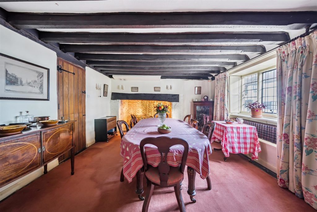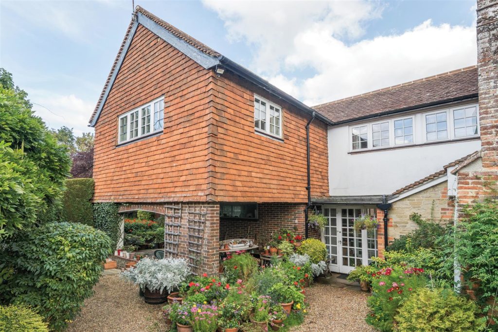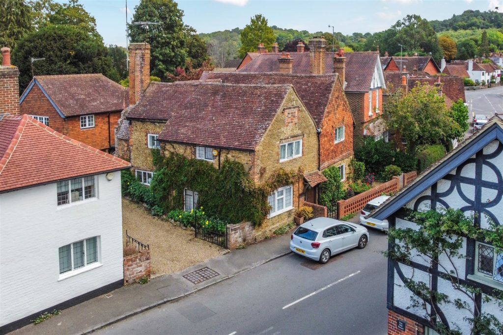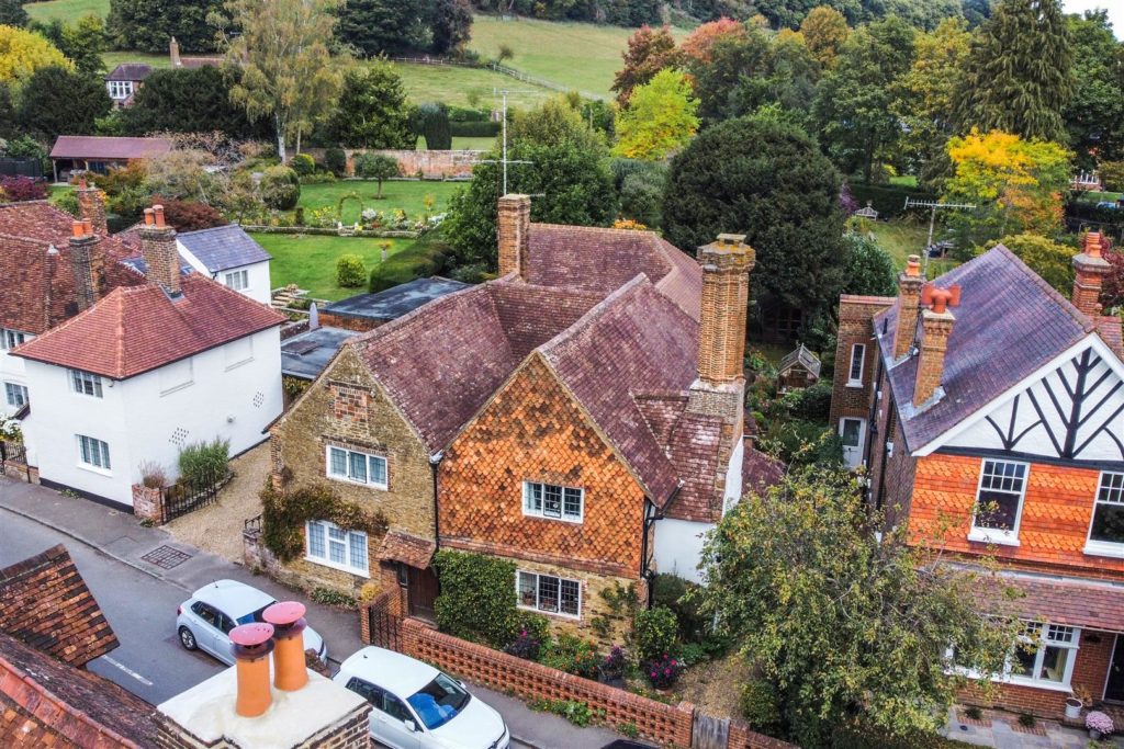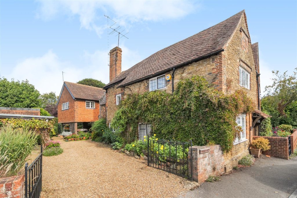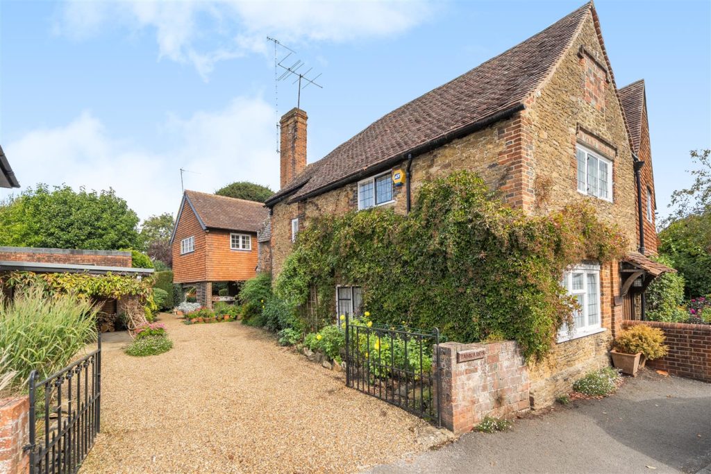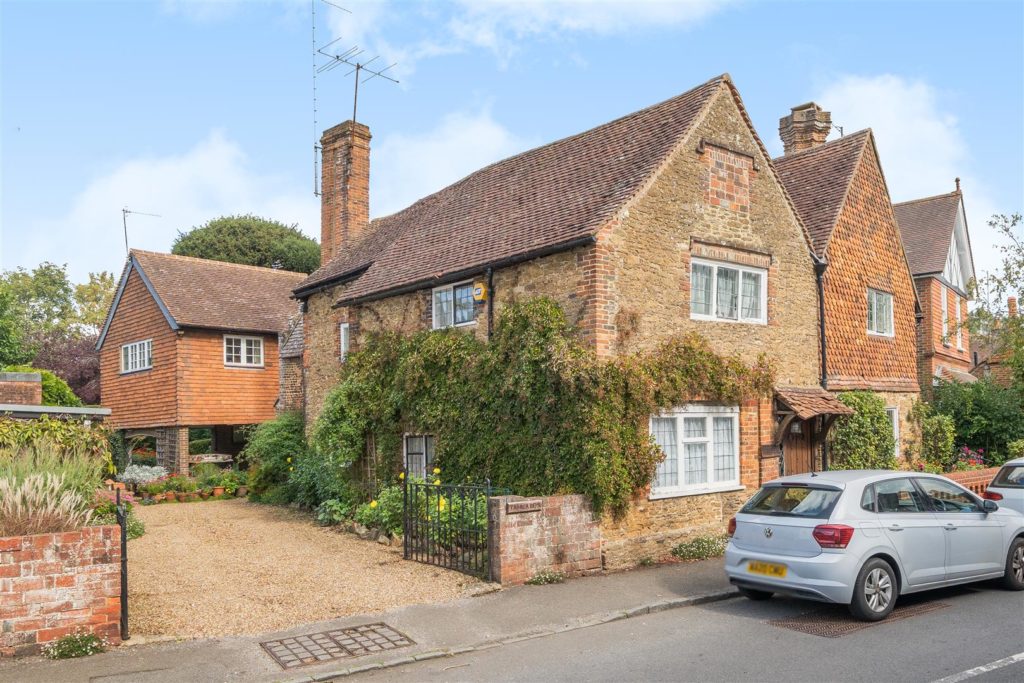 Tankards is an exceptional Grade II listed home of rare character, situated in the heart of Wonersh and offered for sale for the first time in over sixty years. Dating from the 17th century and subsequently extended to the rear, the property blends historic charm with exciting scope for modernisation and reconfiguration. Its distinctive stone and part tile-hung elevations are draped in mature wisteria, while crow-stepped gables and leaded light windows showcase its architectural heritage.Inside, the house is rich in period detail, with exposed beams throughout the older sections and two magnificent inglenook fireplaces—one in the formal dining room and another forming the heart of the double-aspect living room, which also features a log burner and an additional fireplace at the opposite end.The ground floor flows from a welcoming hallway with terracotta tiled flooring to a study ideal for home working, and a generous kitchen with wood units, tiled worktops, terracotta floor, breakfast peninsula, electric oven, gas hob with cooker hood, and space for a freestanding washing machine and tumble dryer, plus side access and a door into the dining room. The formal dining room is an atmospheric space, perfect for entertaining, while the living room spans the width of the property yet retains a cosy feel befitting a home of this character. A second hallway leads from the sitting room to side access on both sides of the property, a downstairs cloakroom, and a library/garden room with double doors opening onto the garden.Upstairs, five well-proportioned double bedrooms are served by a three-piece family bathroom with bath, basin and WC, and a recently refitted shower room featuring a walk-in shower, vanity basin, WC and heated towel rail. There is also storage on the upstairs landing.