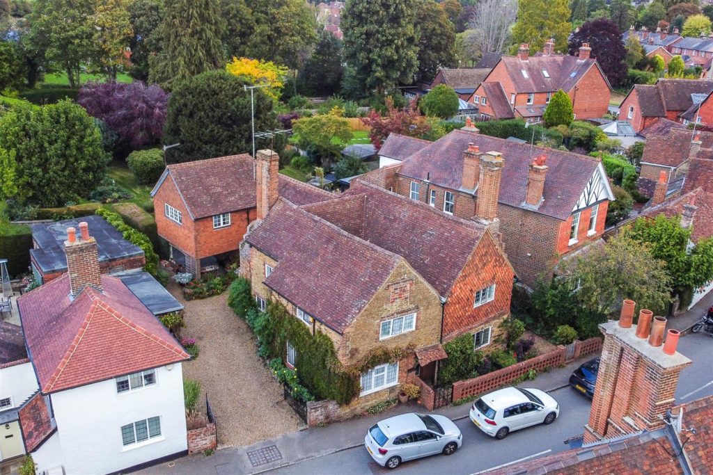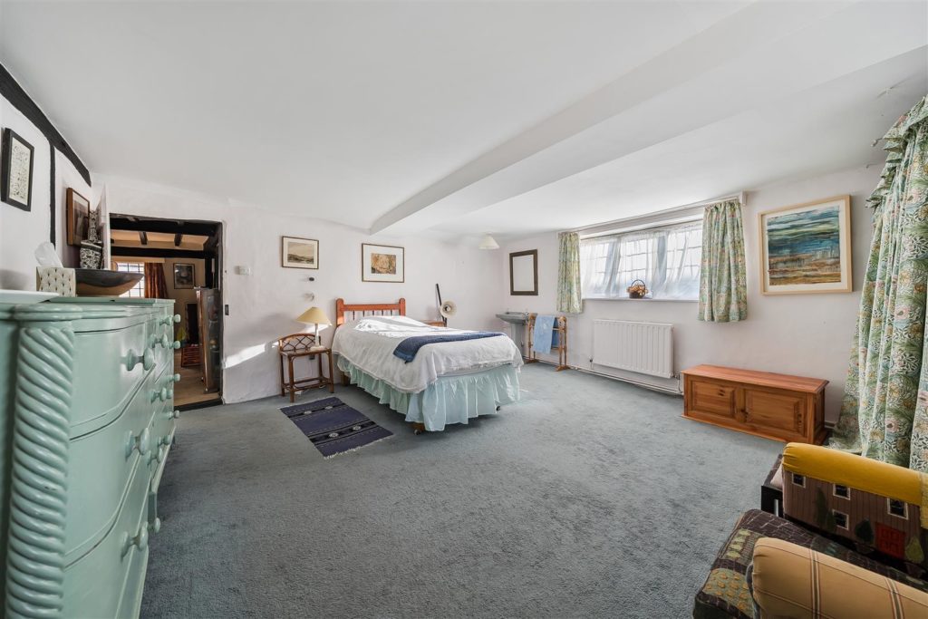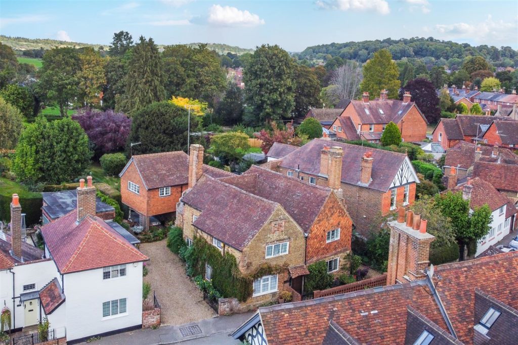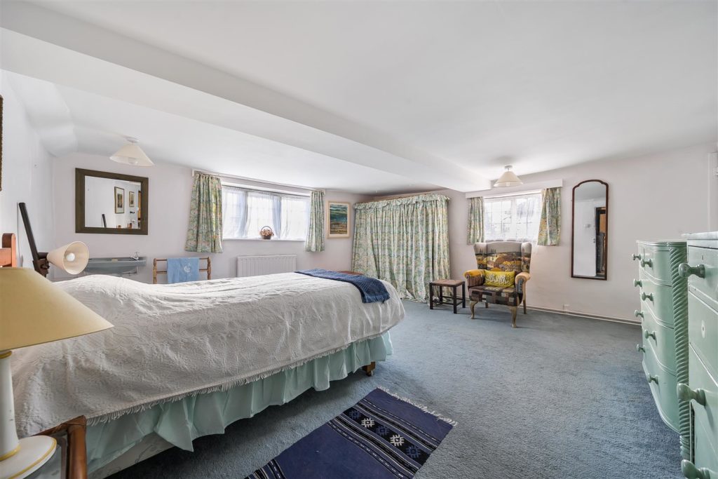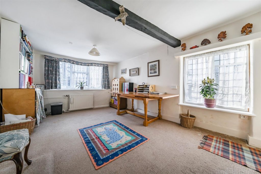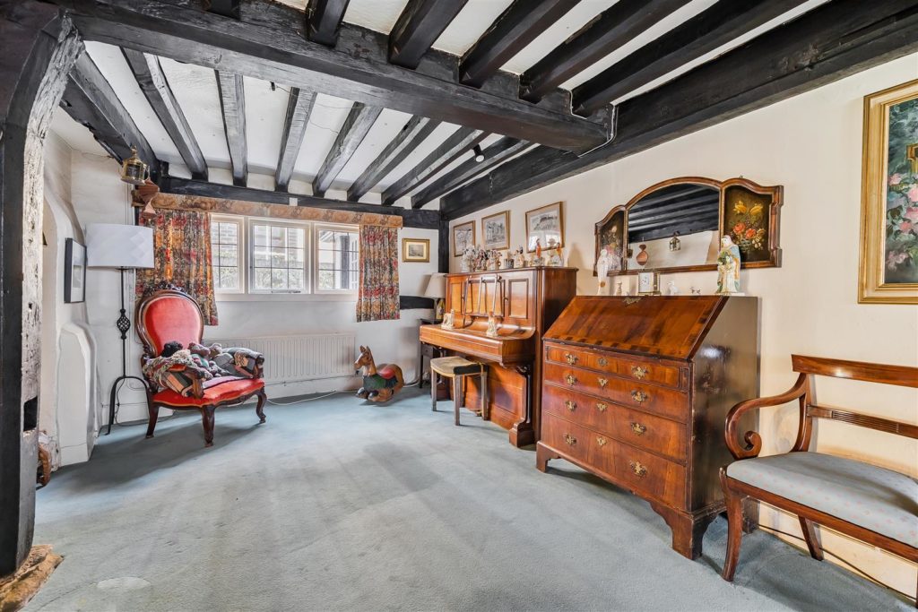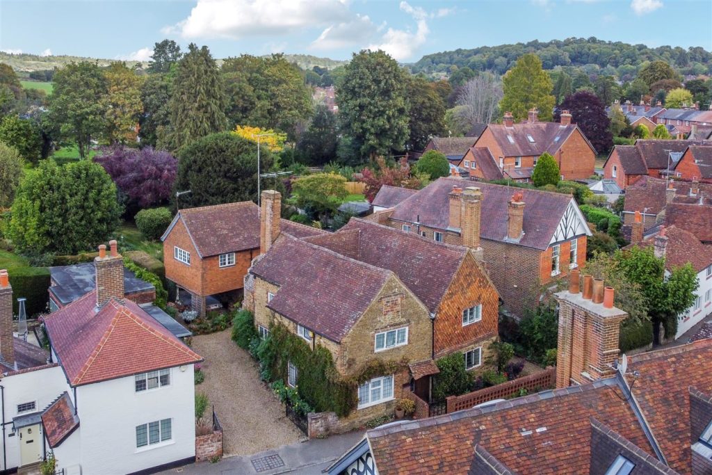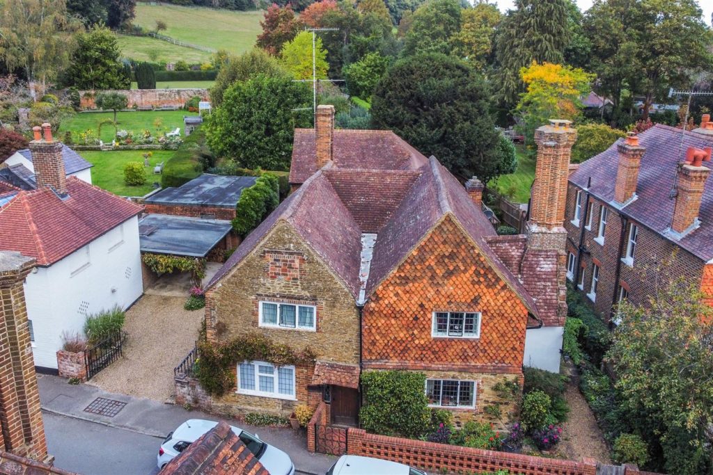 Tankards is an exceptional Grade II listed home of rare character, situated in the heart of Wonersh and offered for sale for the first time in over sixty years. Dating from the 17th century and subsequently extended to the rear, the property blends historic charm with exciting scope for modernisation and reconfiguration. Its distinctive stone and part tile-hung elevations are draped in mature wisteria, while crow-stepped gables and leaded light windows showcase its architectural heritage.Inside, the house is rich in period detail, with exposed beams throughout the older sections and two magnificent inglenook fireplaces—one in the formal dining room and another forming the heart of the double-aspect living room, which also features a log burner and an additional fireplace at the opposite end.The ground floor flows from a welcoming hallway with terracotta tiled flooring to a study ideal for home working, and a generous kitchen with wood units, tiled worktops, terracotta floor, breakfast peninsula, electric oven, gas hob with cooker hood, and space for a freestanding washing machine and tumble dryer, plus side access and a door into the dining room. The formal dining room is an atmospheric space, perfect for entertaining, while the living room spans the width of the property yet retains a cosy feel befitting a home of this character. A second hallway leads from the sitting room to side access on both sides of the property, a downstairs cloakroom, and a library/garden room with double doors opening onto the garden.Upstairs, five well-proportioned double bedrooms are served by a three-piece family bathroom with bath, basin and WC, and a recently refitted shower room featuring a walk-in shower, vanity basin, WC and heated towel rail. There is also storage on the upstairs landing.