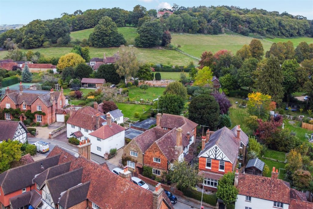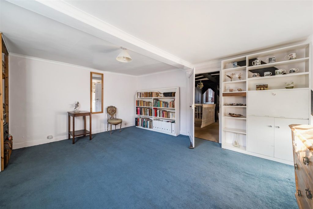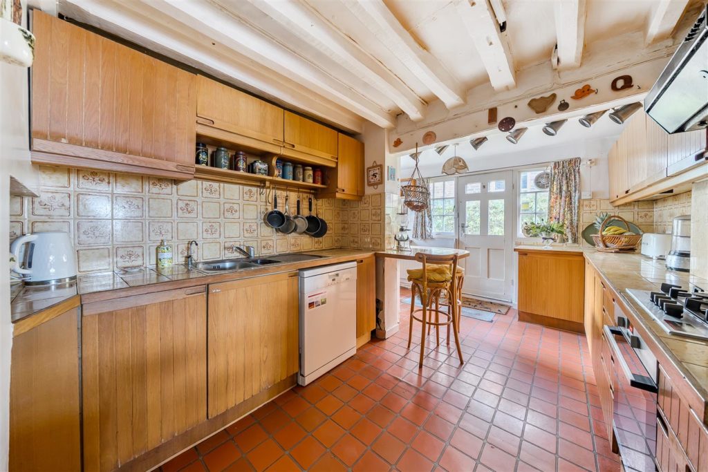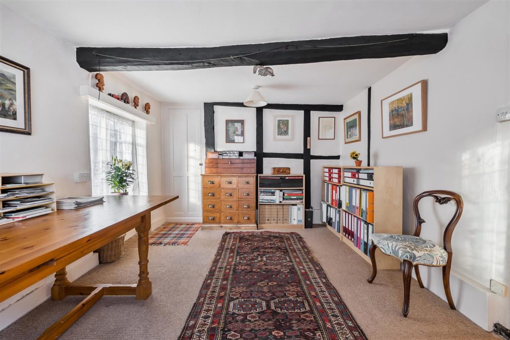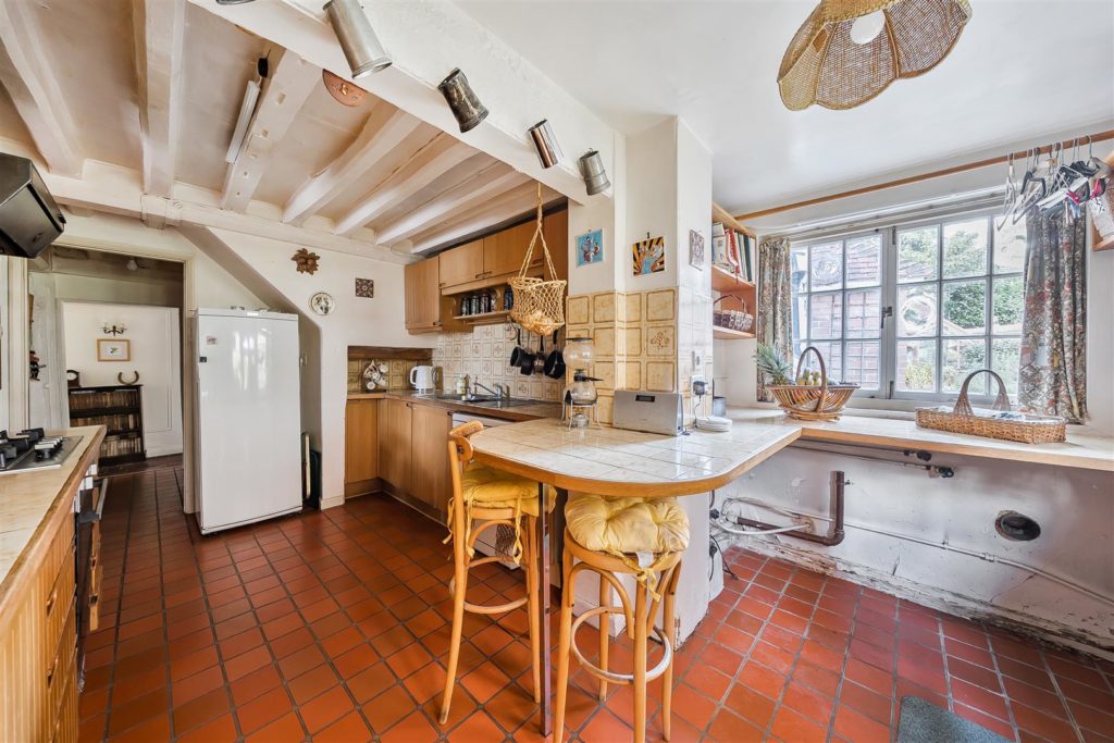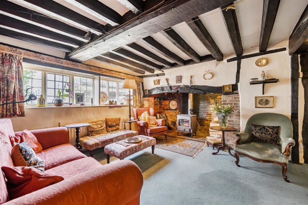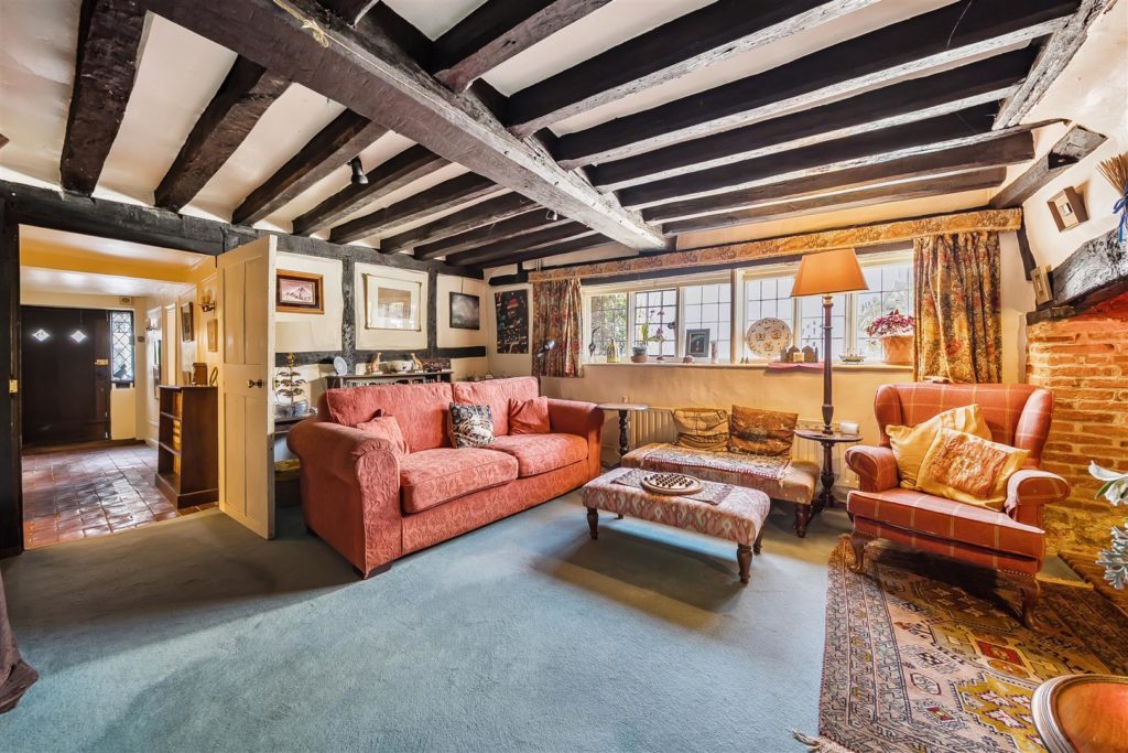 Tankards is an exceptional Grade II listed home of rare character, situated in the heart of Wonersh and offered for sale for the first time in over sixty years. Dating from the 17th century and subsequently extended to the rear, the property blends historic charm with exciting scope for modernisation and reconfiguration. Its distinctive stone and part tile-hung elevations are draped in mature wisteria, while crow-stepped gables and leaded light windows showcase its architectural heritage.Inside, the house is rich in period detail, with exposed beams throughout the older sections and two magnificent inglenook fireplaces—one in the formal dining room and another forming the heart of the double-aspect living room, which also features a log burner and an additional fireplace at the opposite end.The ground floor flows from a welcoming hallway with terracotta tiled flooring to a study ideal for home working, and a generous kitchen with wood units, tiled worktops, terracotta floor, breakfast peninsula, electric oven, gas hob with cooker hood, and space for a freestanding washing machine and tumble dryer, plus side access and a door into the dining room. The formal dining room is an atmospheric space, perfect for entertaining, while the living room spans the width of the property yet retains a cosy feel befitting a home of this character. A second hallway leads from the sitting room to side access on both sides of the property, a downstairs cloakroom, and a library/garden room with double doors opening onto the garden.Upstairs, five well-proportioned double bedrooms are served by a three-piece family bathroom with bath, basin and WC, and a recently refitted shower room featuring a walk-in shower, vanity basin, WC and heated towel rail. There is also storage on the upstairs landing.