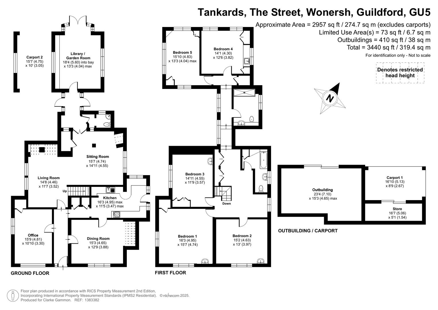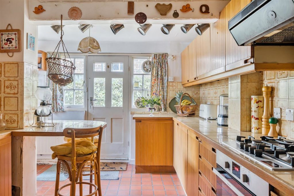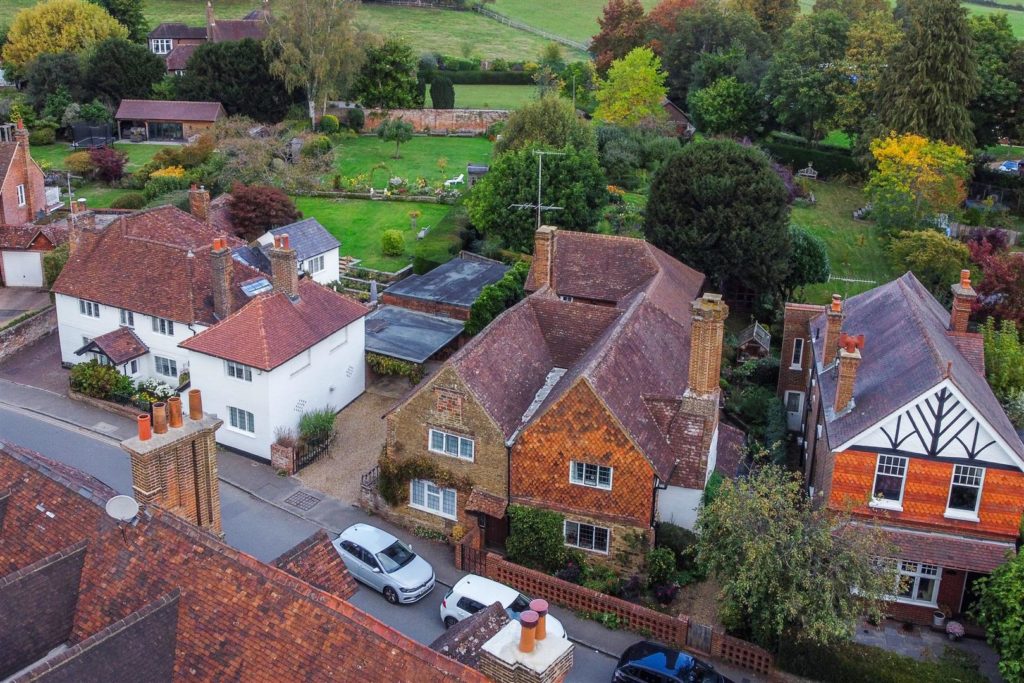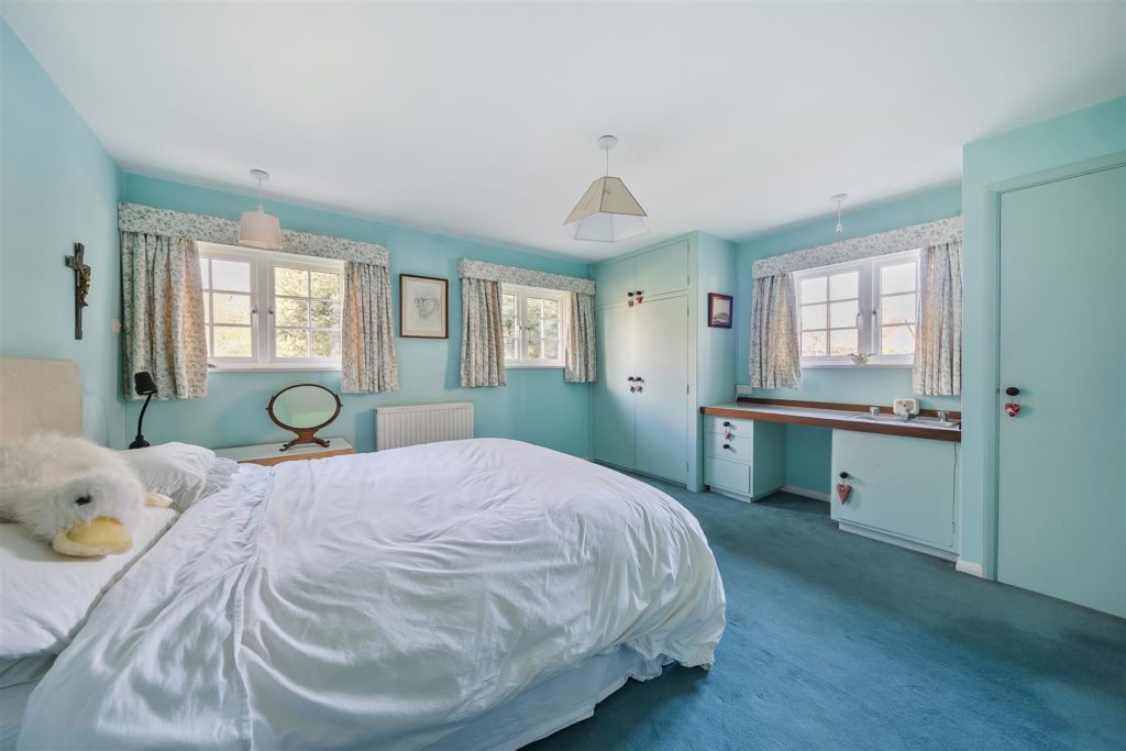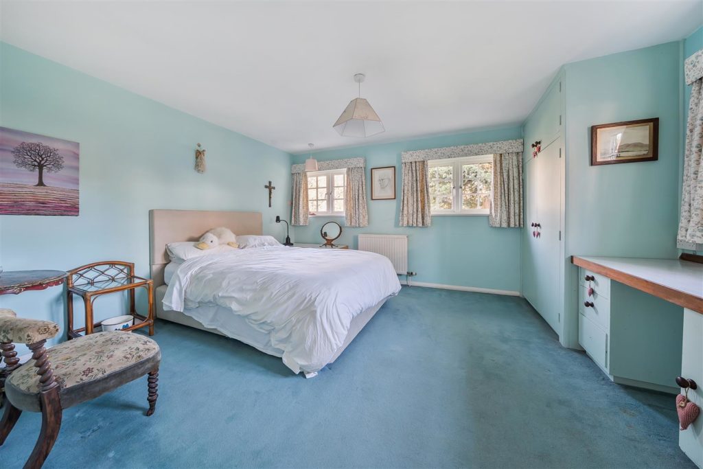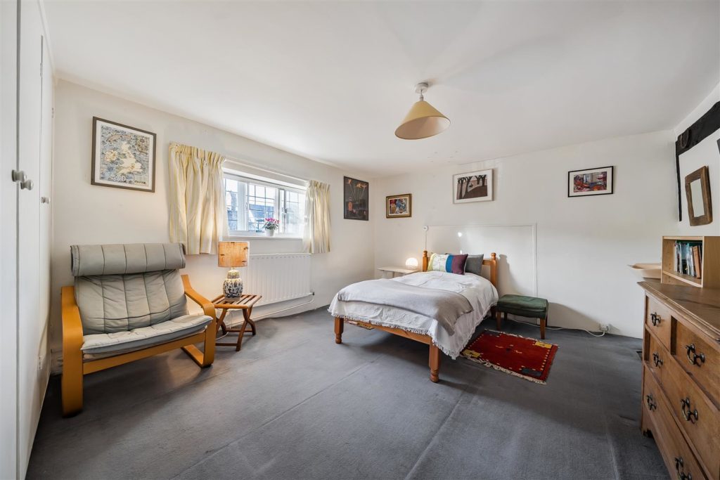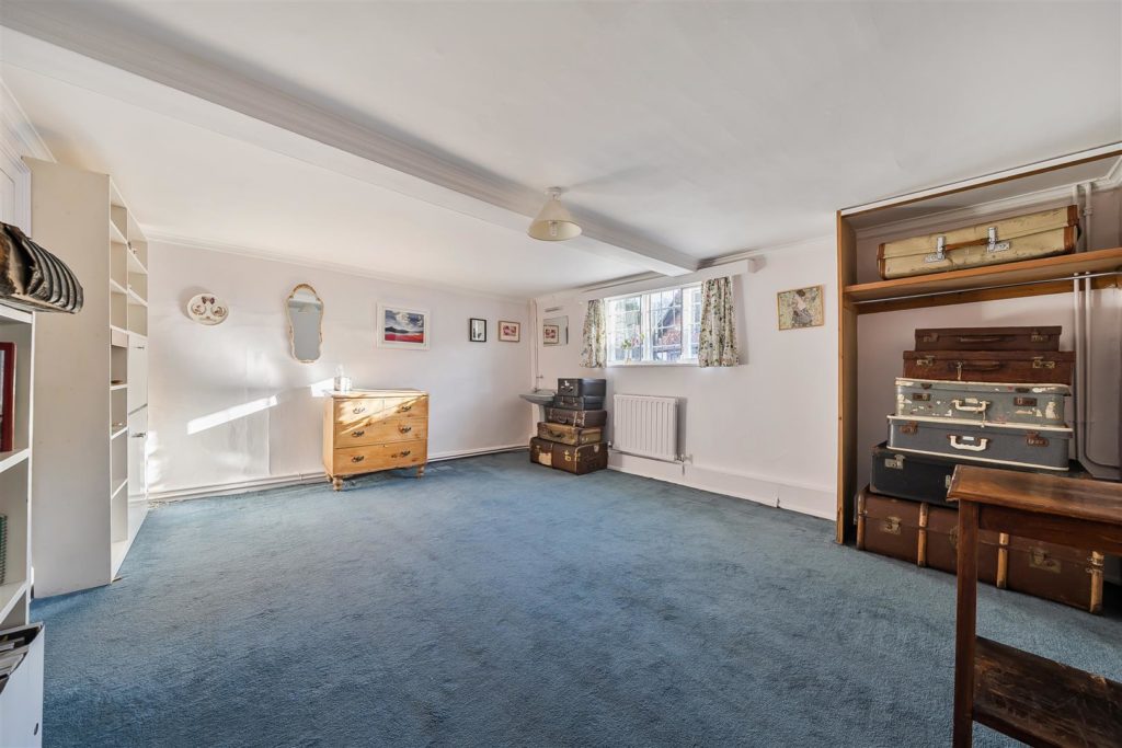Tankards is an exceptional Grade II listed home of rare character, situated in the heart of Wonersh and offered for sale for the first time in over sixty years. Dating from the 17th century and subsequently extended to the rear, the property blends historic charm with exciting scope for modernisation and reconfiguration. Its distinctive stone and part tile-hung elevations are draped in mature wisteria, while crow-stepped gables and leaded light windows showcase its architectural heritage.Inside, the house is rich in period detail, with exposed beams throughout the older sections and two magnificent inglenook fireplaces—one in the formal dining room and another forming the heart of the double-aspect living room, which also features a log burner and an additional fireplace at the opposite end.The ground floor flows from a welcoming hallway with terracotta tiled flooring to a study ideal for home working, and a generous kitchen with wood units, tiled worktops, terracotta floor, breakfast peninsula, electric oven, gas hob with cooker hood, and space for a freestanding washing machine and tumble dryer, plus side access and a door into the dining room. The formal dining room is an atmospheric space, perfect for entertaining, while the living room spans the width of the property yet retains a cosy feel befitting a home of this character. A second hallway leads from the sitting room to side access on both sides of the property, a downstairs cloakroom, and a library/garden room with double doors opening onto the garden.Upstairs, five well-proportioned double bedrooms are served by a three-piece family bathroom with bath, basin and WC, and a recently refitted shower room featuring a walk-in shower, vanity basin, WC and heated towel rail. There is also storage on the upstairs landing.