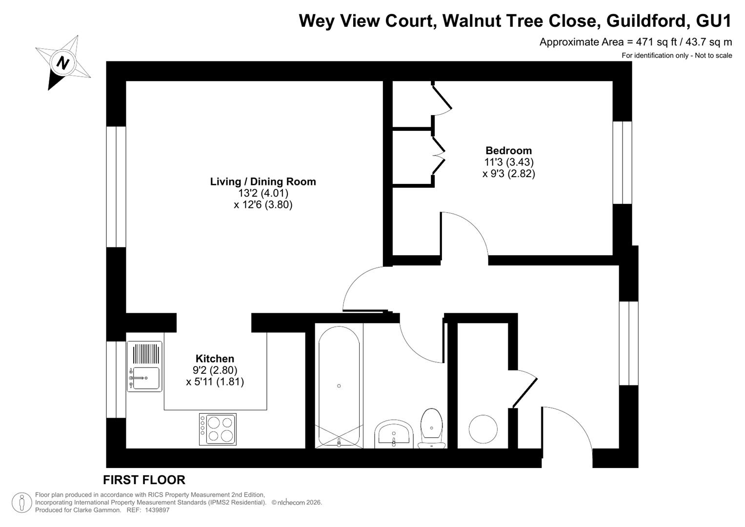 Central Guildford and situated within a peaceful development along the banks of the River Wey, this recently refurbished one-bedroom first floor apartment offers bright, well-proportioned accommodation together with attractive communal grounds and allocated parking.The property has been recently updated, including a modern fitted kitchen and contemporary bathroom, creating a stylish and ready-to-move-into home. The apartment is accessed via a well-maintained communal entrance, leading into a generous hallway with useful storage.The main living room enjoys a pleasant outlook and ample room for both seating and dining, with an open archway leading through to the kitchen. The newly fitted kitchen is well arranged with a range of modern units, work surfaces and appliances. The bedroom is a comfortable double with built-in storage, served by a recently updated bathroom suite finished to a clean and contemporary standard.A particular feature of the development is its proximity to the River Wey, with attractive communal gardens and green spaces providing a tranquil setting. The property also benefits from one allocated parking space, together with additional visitor parking.